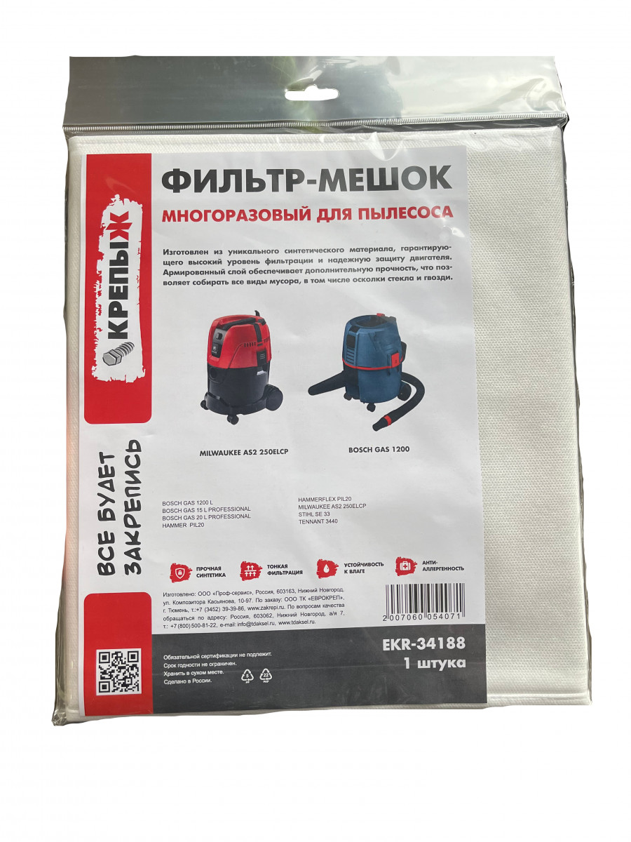 Мешок КРЕПЫЖ EKR-34188 оснащен пластиковым клапаном для удобной фиксации в пылесосе и разработан для многоразового применения.