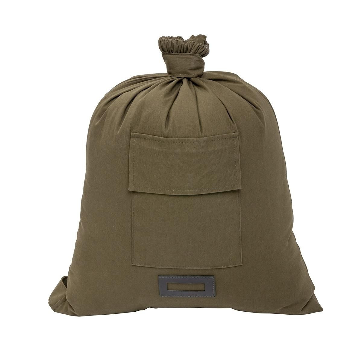 Мешок вещевой объемом 30 л. Спереди мешка имеется плоский карман с клапаном и кожаная рамка для таблички. К нижним углам мешка пришит длинный ремень, которым стягивается верх мешка и формируются лямки.Объем: 30 л;