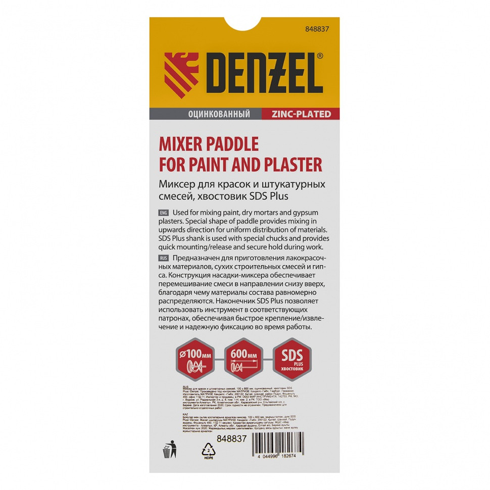Миксер для красок и штукатурных смесей, 100 х 600 мм, оцинкованный, хвостовик SDS Plus Denzel