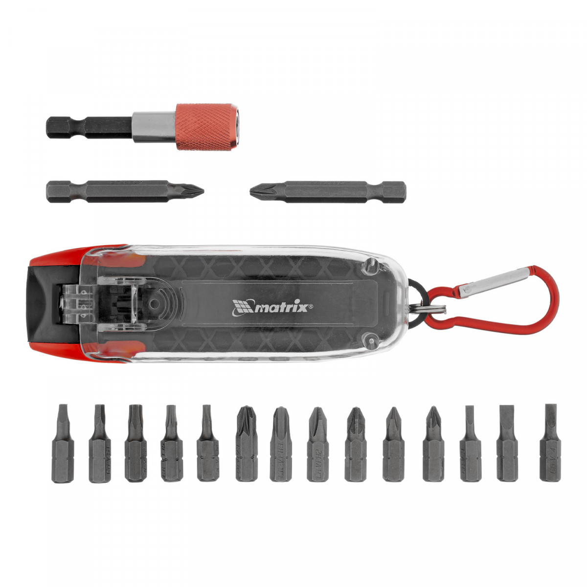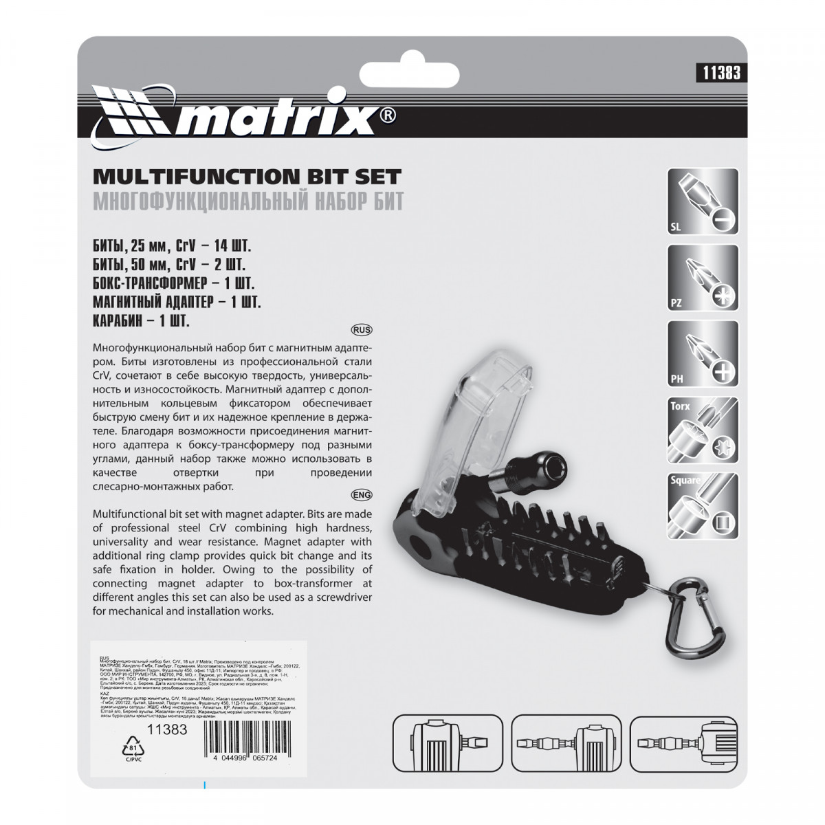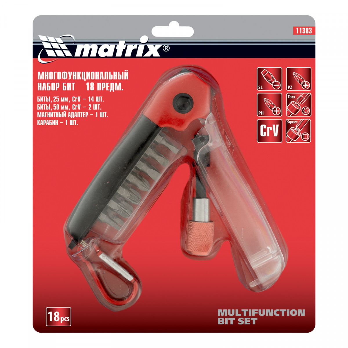 Многофункциональный набор Matrix 11383 включает 18 бит из стали CrV для шуруповертов, ручных и механических отверток. В комплект входит 14 бит разных типоразмеров длиной 25 мм и 2 удлиненные биты 50 мм для работ в труднодоступных местах. Они позволяют проводить монтажные/демонтажные работы с шурупами и саморезами, имеющими шлицы различного типа. Набор будет полезен для решения бытовых и профессиональных задач по сборке мебели и ремонту техники.