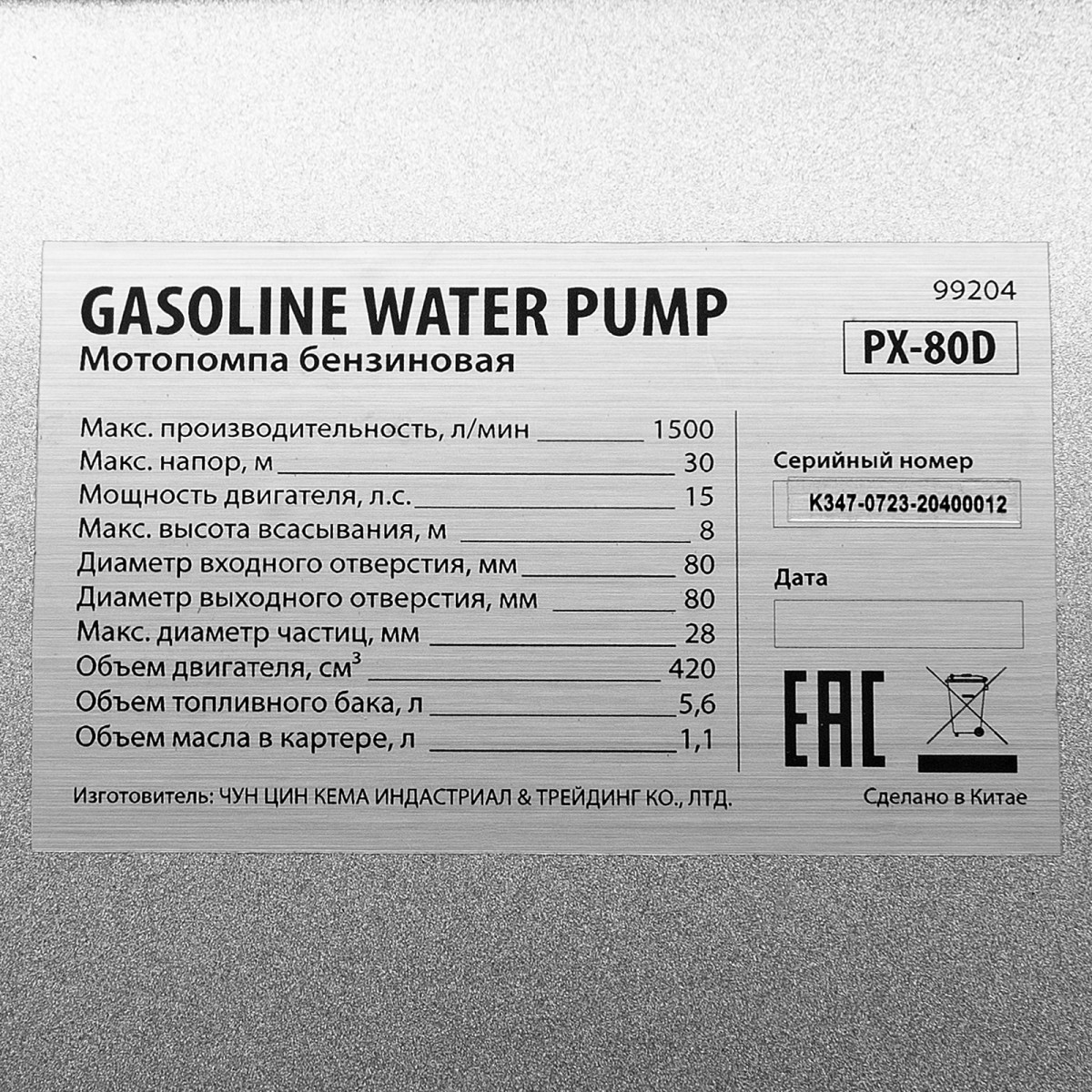 Мотопомпа бензиновая для грязной воды PX-80D, 15 л.с, 3", 1500 л/мин, глубина 8 м , напор 30 м Denzel