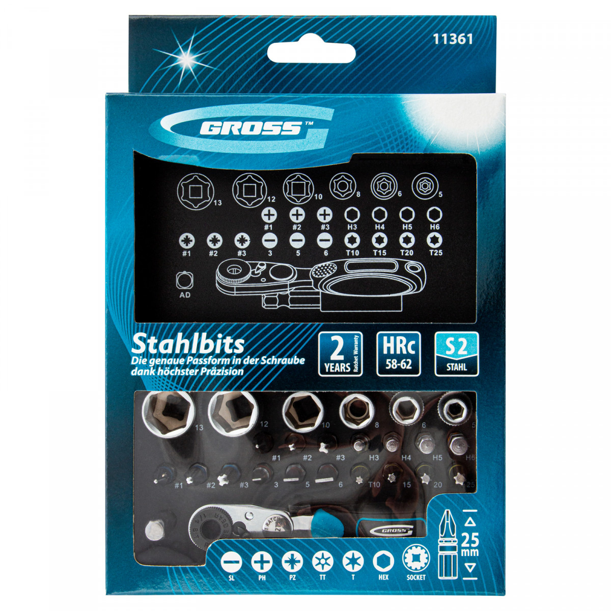 - Высокий ресурс — биты из японской легированной стали S2 твердостью 52-54 HRC и торцевые головки из хромованадиевой стали твердостью 48 HRC обладают повышенной прочностью, износостойкостью и рассчитаны на долгую службу.