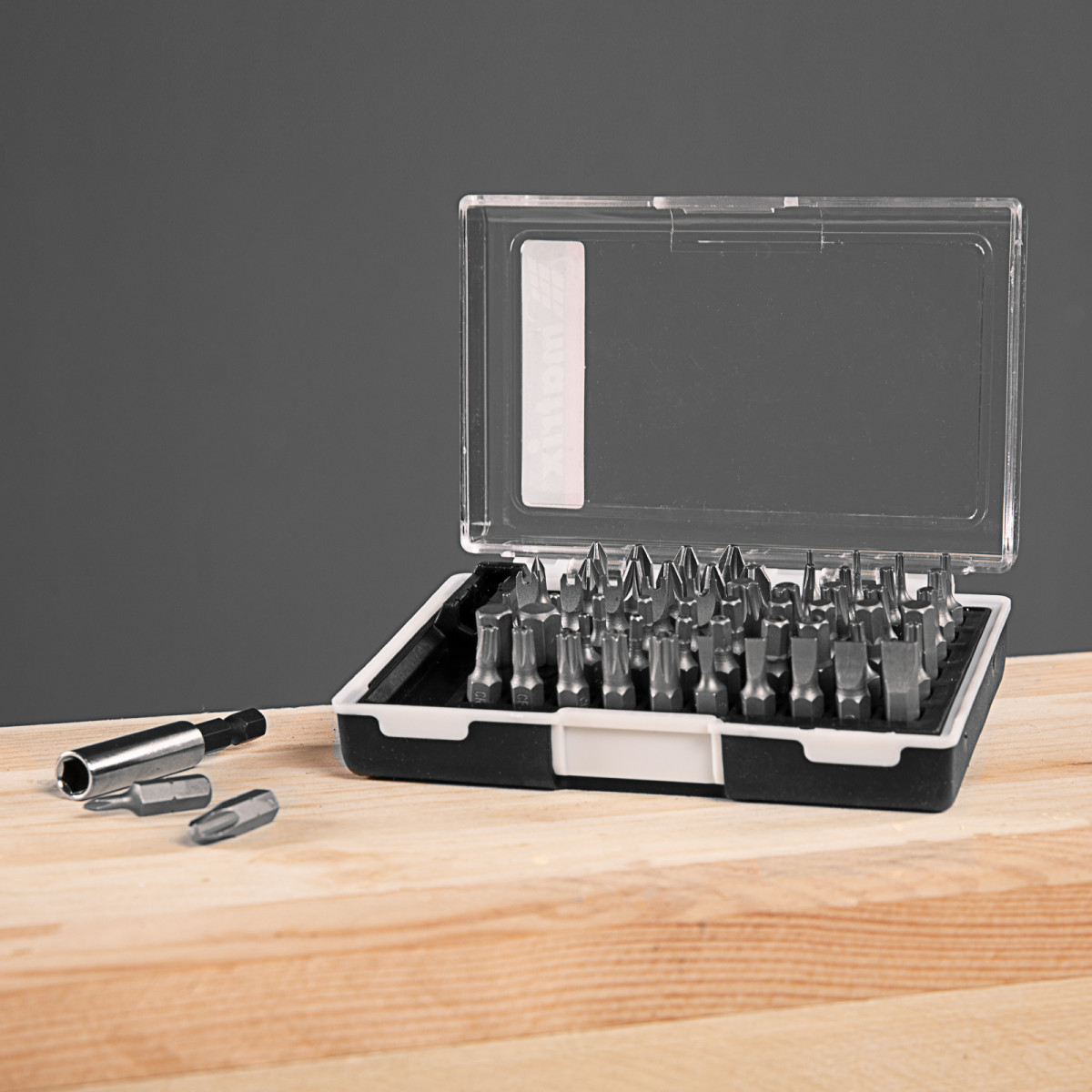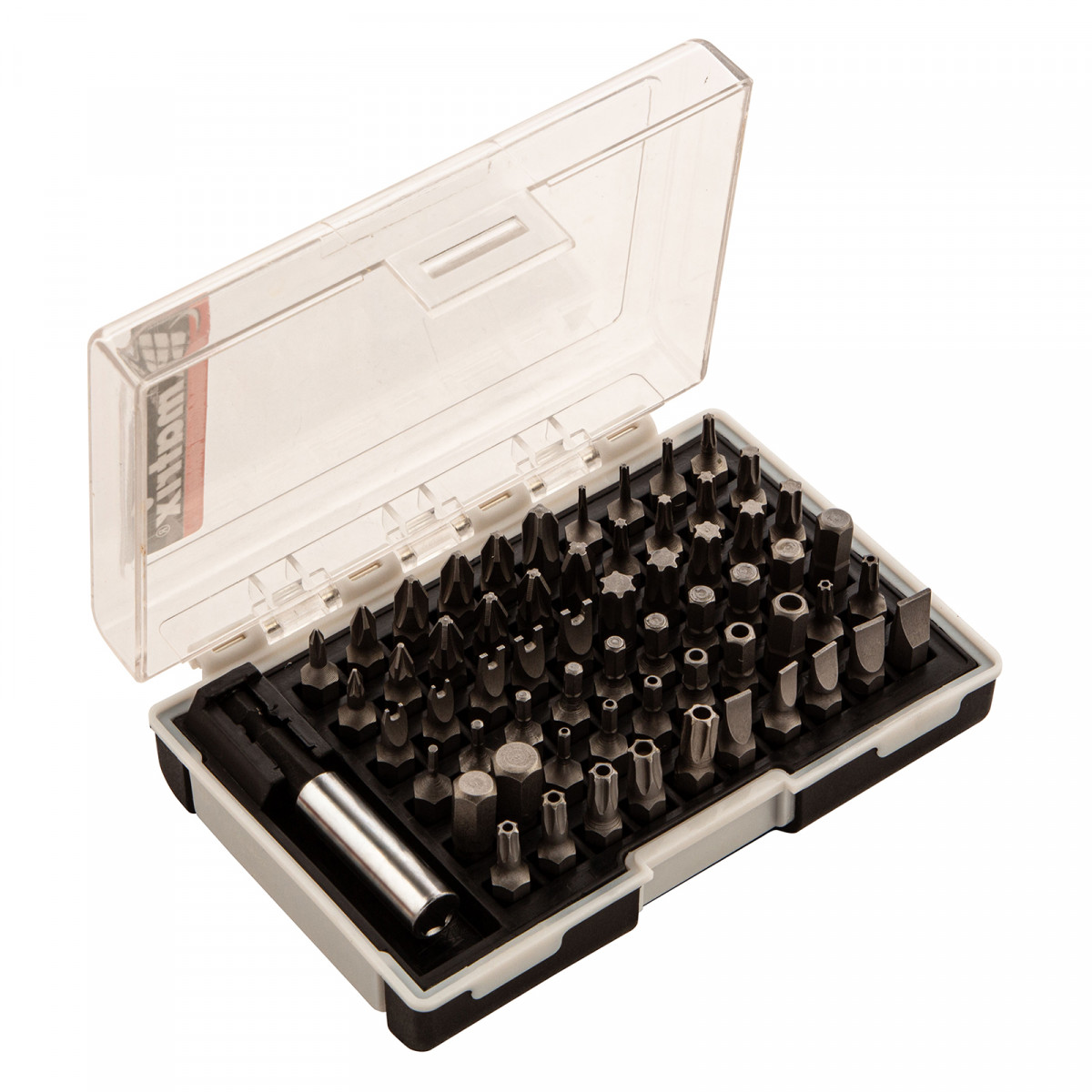 Набор Matrix 11387 состоит из 61 предмета: 60 бит из стали CrV и магнитного держателя. Включает сразу несколько типоразмеров бит длиной 25 мм: SL калибров 3, 4, 5, 5,5, 6, 7, 8, PZ и PH № 0-3, HEX № 1,5, 1,5, 2, 2,5, 3, 3,5, 4, 4,5, 5, 5,5, 6, 7, 8, TORX 5, 6, 8, 9, 10, 15, 20, 27, 30, 35, 40, Spanner калибров 4, 6, 8, 10, TORX Tamper 10, 15, 20, 25, 27, 30, 35, HS № 2, 2,5, 3, 4, 5, 6. Насадки используются в качестве оснастки на шуруповертах и реверсивных отвертках, применяются для монтажа и демонтажа резьбовых крепежей.