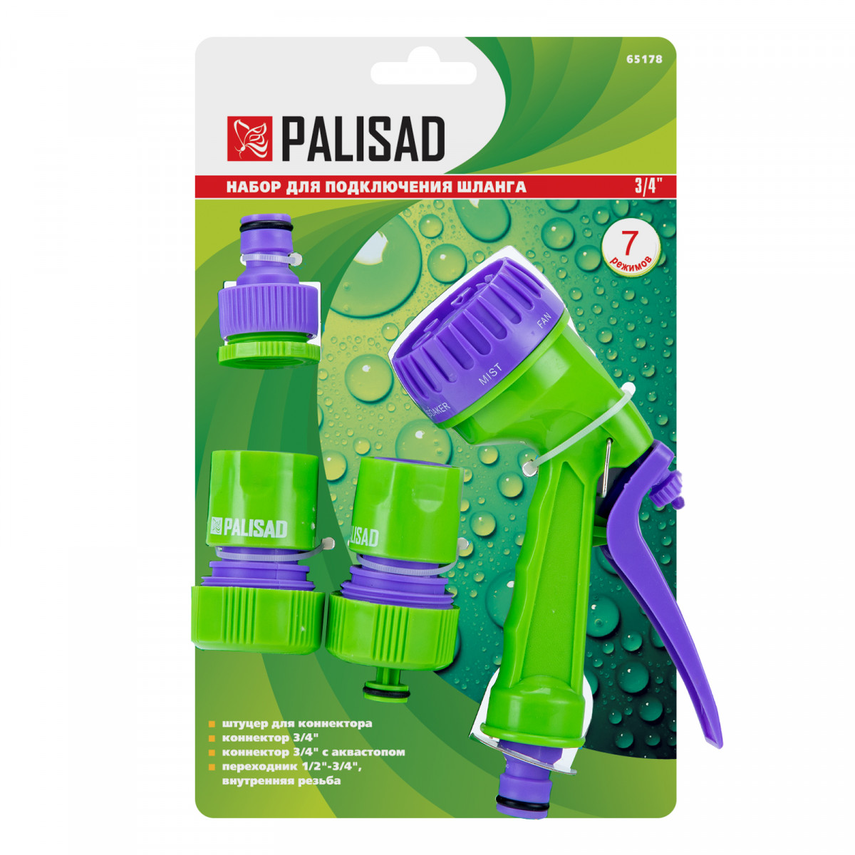 Набор для подключения шланга 3/4, пистолет 7 режимов полива, адаптер, 2 соединителя Palisad