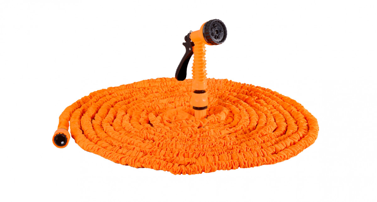 Набор для полива подходит для орошения дачных и садовых участков. Комплектуется пистолетом-распылителем с 7 режимами. Шланг из прочного латекса может сжиматься и растягиваться, что удобно при поливе и хранении.