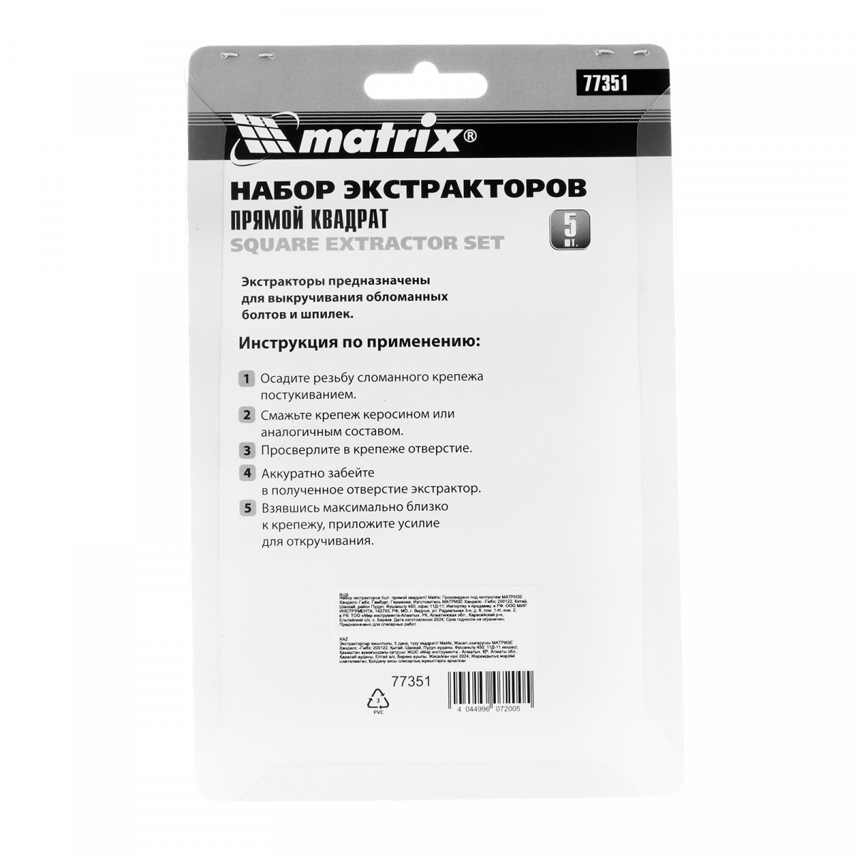Набор экстракторов Matrix 77351, 5 шт., прямой квадрат, рассчитан на извлечение сломанных болтов и шпилек с правой резьбой. Он станет незаменимым помощником для частных и профессиональных мастеров на строительной площадке, в гараже и мастерской.