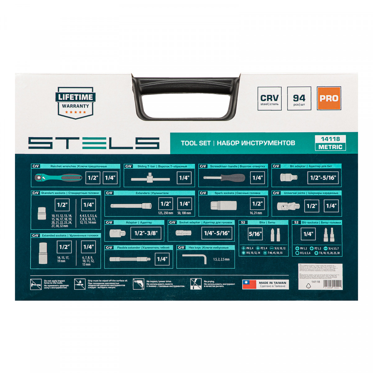 Набор инструментов Stels 14118 в ударопрочным пластиковом кейсе состоит из 94 предметов с присоединительными квадратами 1/2″ и 1/4″, из стали CrV и S2, и предназначен для выполнения слесарно-монтажных работ. Включает инструменты и насадки для работы с резьбовыми крепежами, в том числе 12-гранные торцевые головки, т-образный вороток и удлинители (в том числе гибкий), облегчающие работу в труднодоступных местах. Набор предназначен для профессионального использования в автомастерской, будет полезен и для решения бытовых задач.