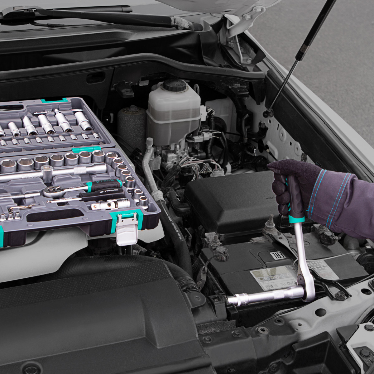 • Комфортная работа в труднодоступных местах — в набор входят ключи-трещотки с 72 зубьями, рабочий шаг составляет всего 5°.