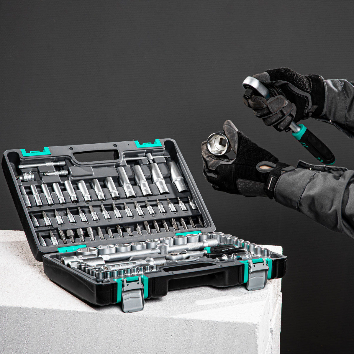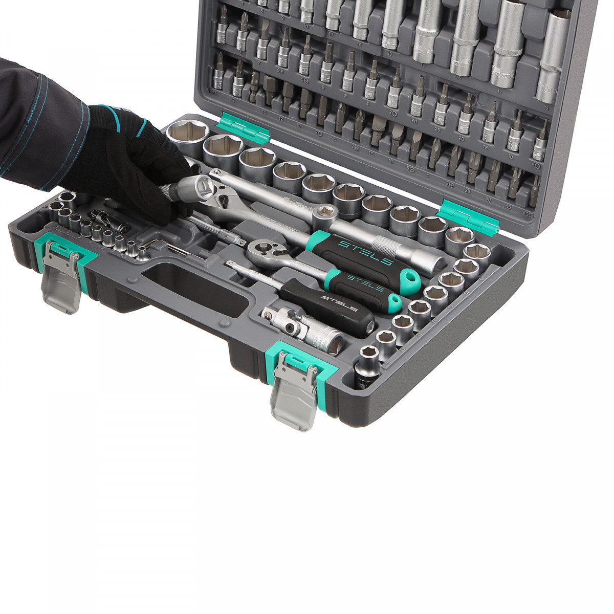 Набор инструментов Stels 14106 в ударопрочным пластиковом кейсе состоит из 94 предметов с присоединительными квадратами 1/2″ и 1/4″, из стали CrV и S2, и предназначен для выполнения слесарно-монтажных работ. Включает инструменты и насадки для работы с резьбовыми крепежами, а также удлинители (в том числе гибкий) и т-образный вороток, облегчающие работу в труднодоступных местах. Набор предназначен для профессионального использования в автомастерской, будет полезен и для решения бытовых задач.