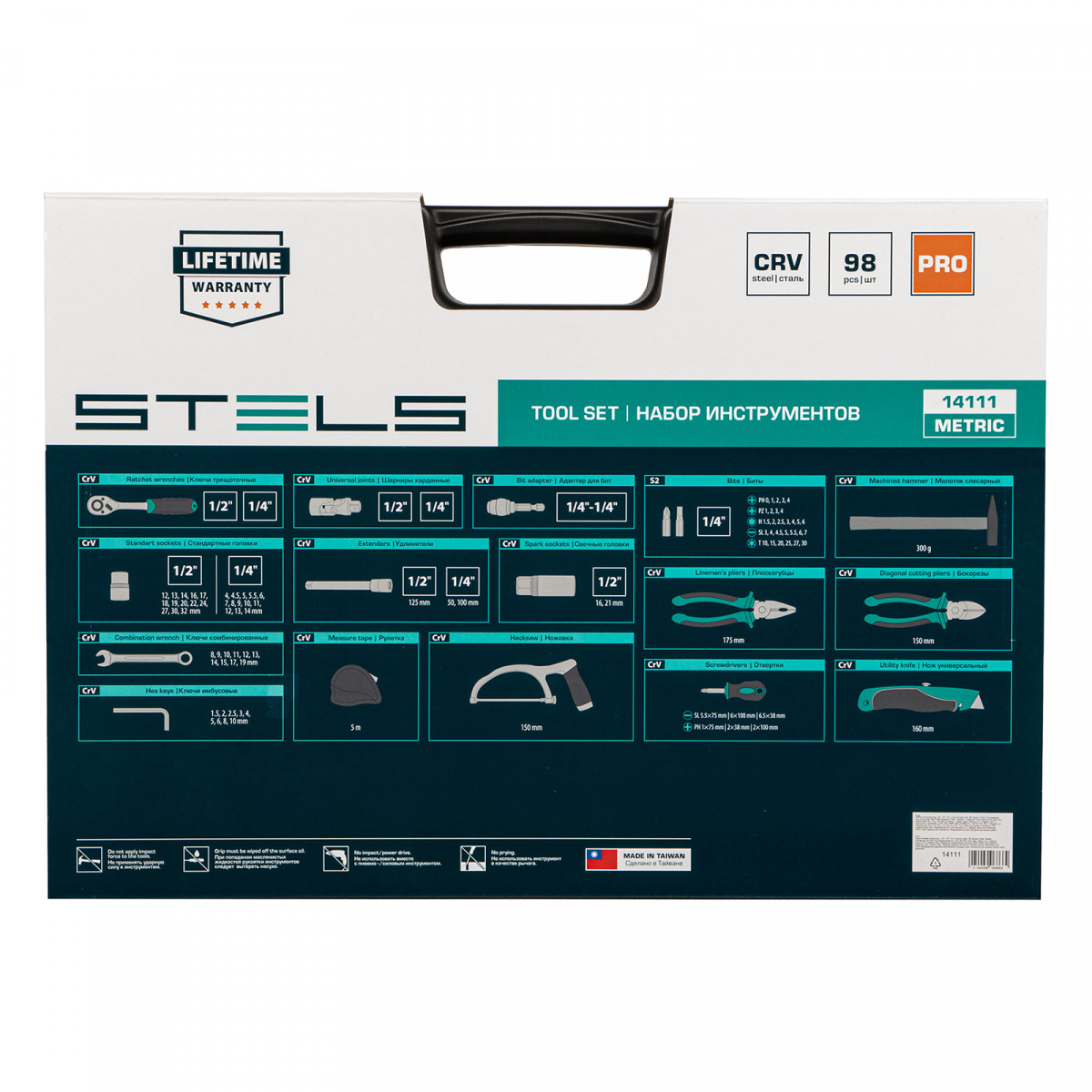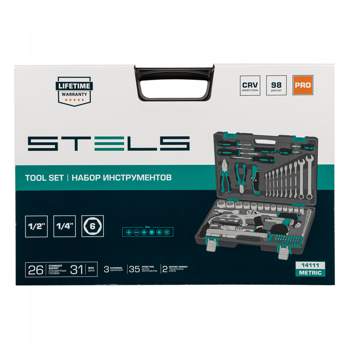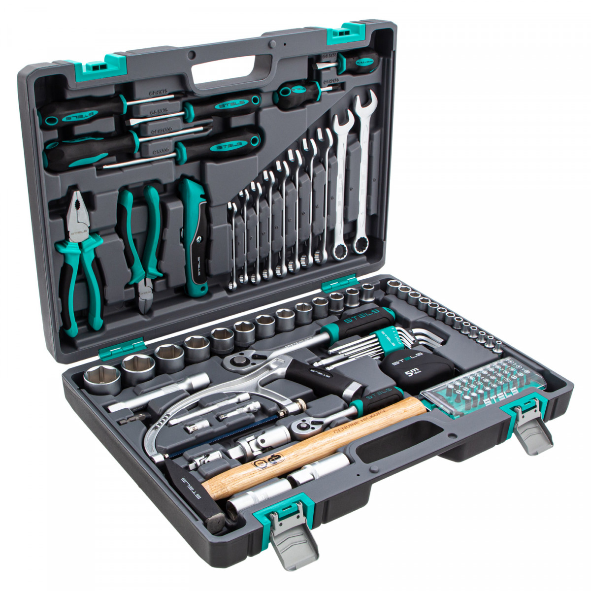 Набор инструментов Stels 14111 в ударопрочным пластиковом кейсе состоит из 98 предметов с присоединительными квадратами 1/2″ и 1/4″, из стали CrV и S2, и предназначен для выполнения слесарно-монтажных работ. Включает инструменты и насадки для работы с резьбовыми крепежами, а также удлинители, облегчающие работу в труднодоступных местах. Молоток, плоскогубцы, бокорезы, ручная ножовка, хозяйственный нож и рулетка расширяют возможности использования набора. Набор предназначен для профессионального использования в автомастерской, будет полезен и для решения бытовых задач.