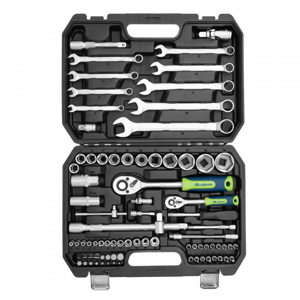 Набор инструментов Сибртех 13391 упакован в пластиковый кейс и состоит из 82 предметов с присоединительным размером 1/2" и 1/4", предназначенных для слесарных работ, преимущественно монтажа и демонтажа резьбового крепежа с разными типами шлицев. В комплект поставки входят карданы, удлинители и переходники, облегчающие работу в труднодоступных местах. Набор используется для ремонта автомобилей, а также полезен в быту.