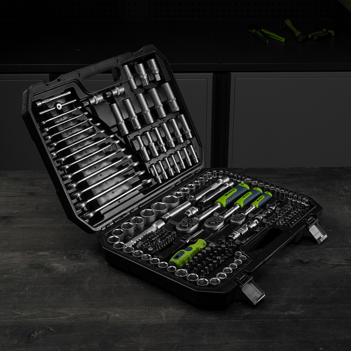 Набор инструментов Сибртех 14170 упакован в пластиковый кейс и состоит из 215 предметов с присоединительным размером 1/2", 3/8", 1/4", предназначенных для монтажа и демонтажа резьбового крепежа с разными типами шлицев. В комплект поставки входят карданы, удлинители и переходники, облегчающие работу в труднодоступных местах. Набор используется для ремонта автомобилей, а также будет полезен в быту.