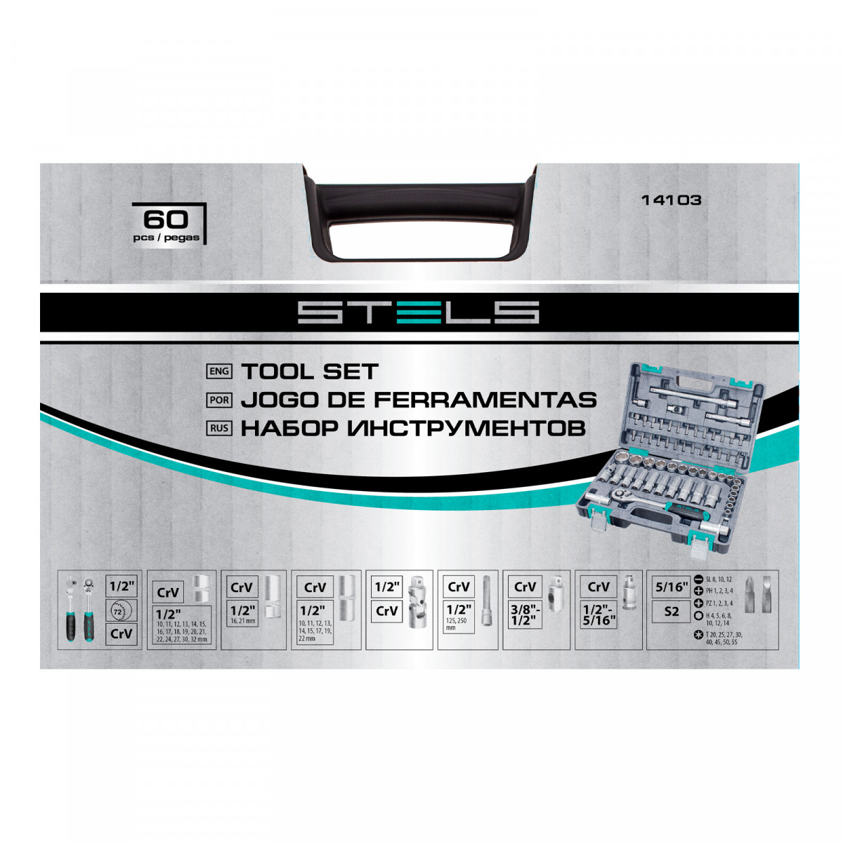 Набор инструментов, 1/2", CrV, пластиковый кейс 60 предметов Stels