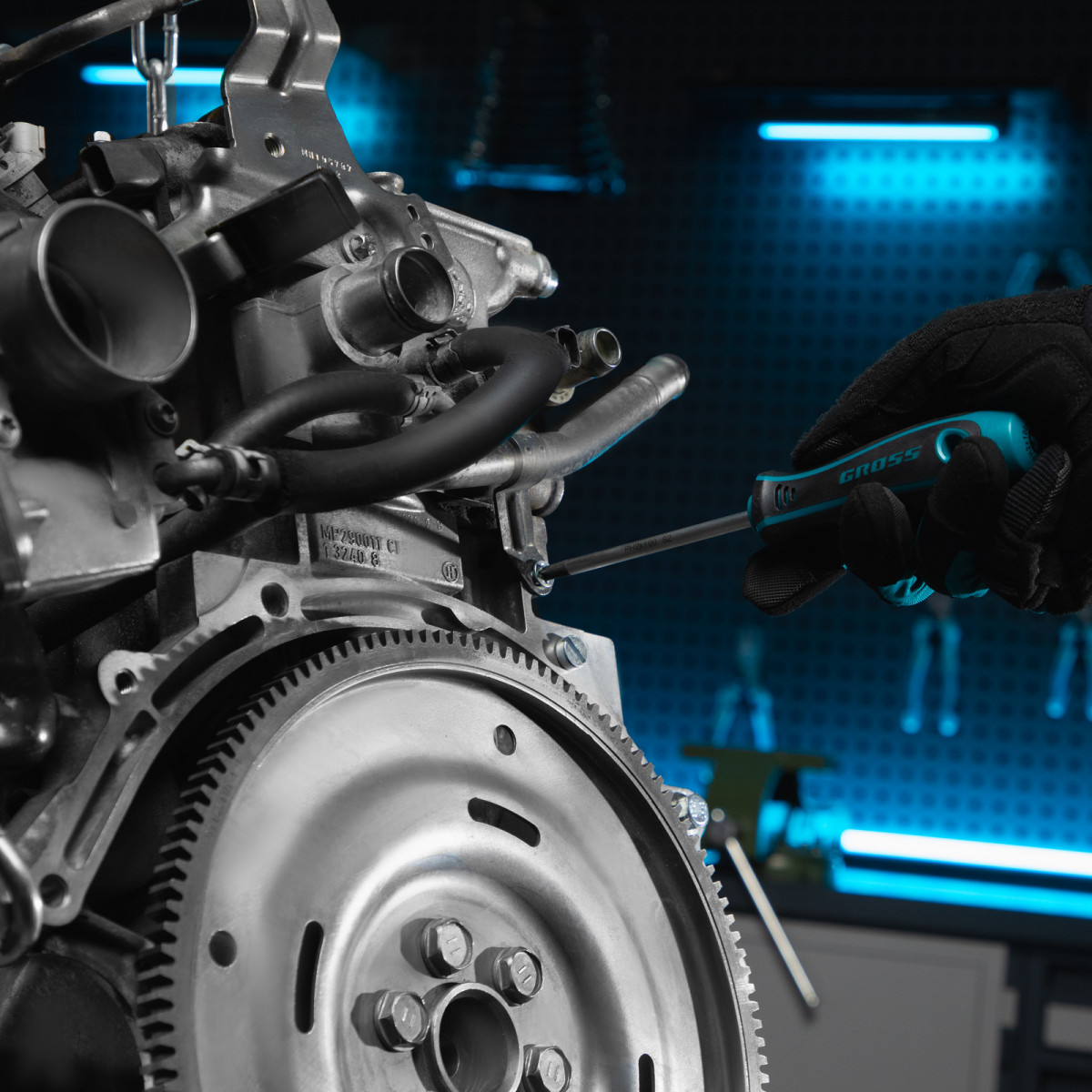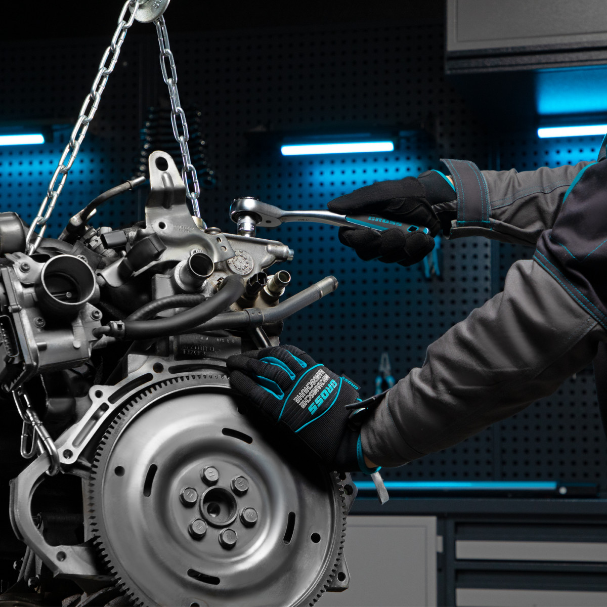 - Работа со значительным усилием — гаечные ключи с дополнительным ребром жесткости на корпусе и цельнокованые трещотки выдерживают высокие нагрузки.