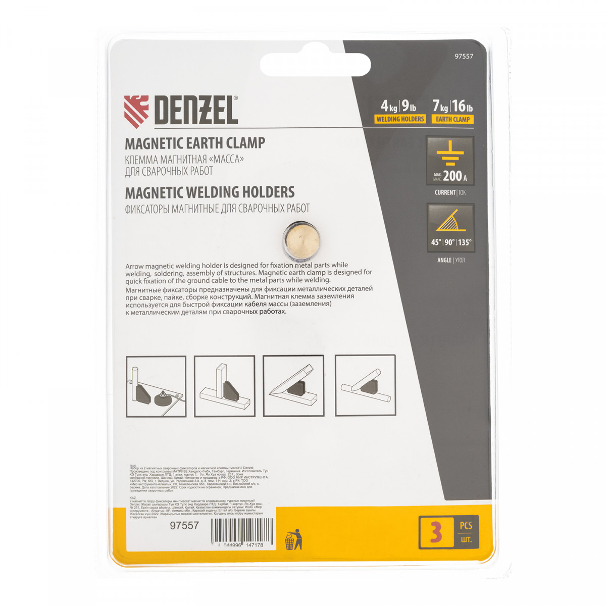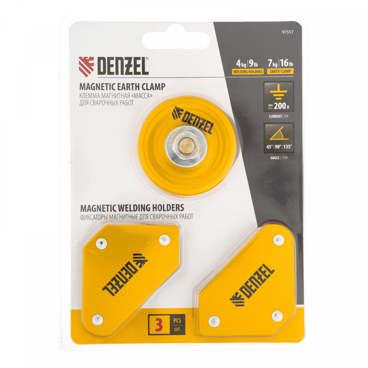 Набор из 2 магнитных сварочных фиксаторов и магнитной клеммы "масса" Denzel