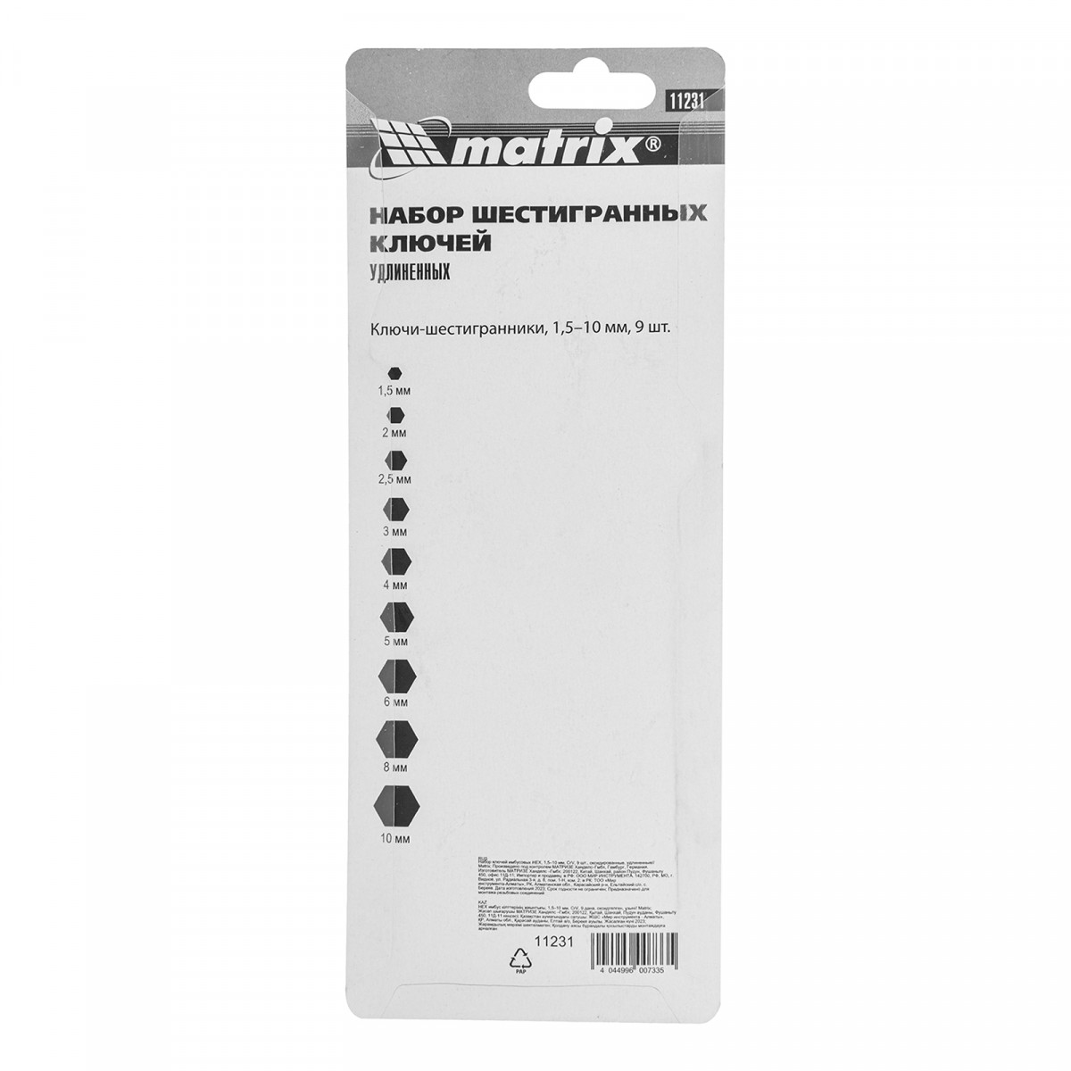 Набор Matrix 11231 из 9 удлиненных оксидированных имбусовых ключей размером 1,5-10 мм, из стали CrV, используется для монтажа и демонтажа крепежа со шлицем HEX. Шестигранники наиболее часто применяются для закручивания мебельных евровинтов и ремонта велосипедов. Удлиненные рабочие части обеспечивают удобный доступ в труднодоступные места.