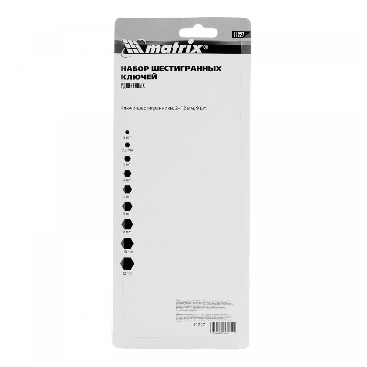 Набор Matrix 11227 из 9 удлиненных оксидированных имбусовых ключей размером 2,0-12 мм, из стали CrV, используется для монтажа и демонтажа крепежа со шлицем HEX. Шестигранники наиболее часто применяются для закручивания мебельных евровинтов и ремонта велосипедов. Удлиненные рабочие части обеспечивают удобный доступ в труднодоступные места.