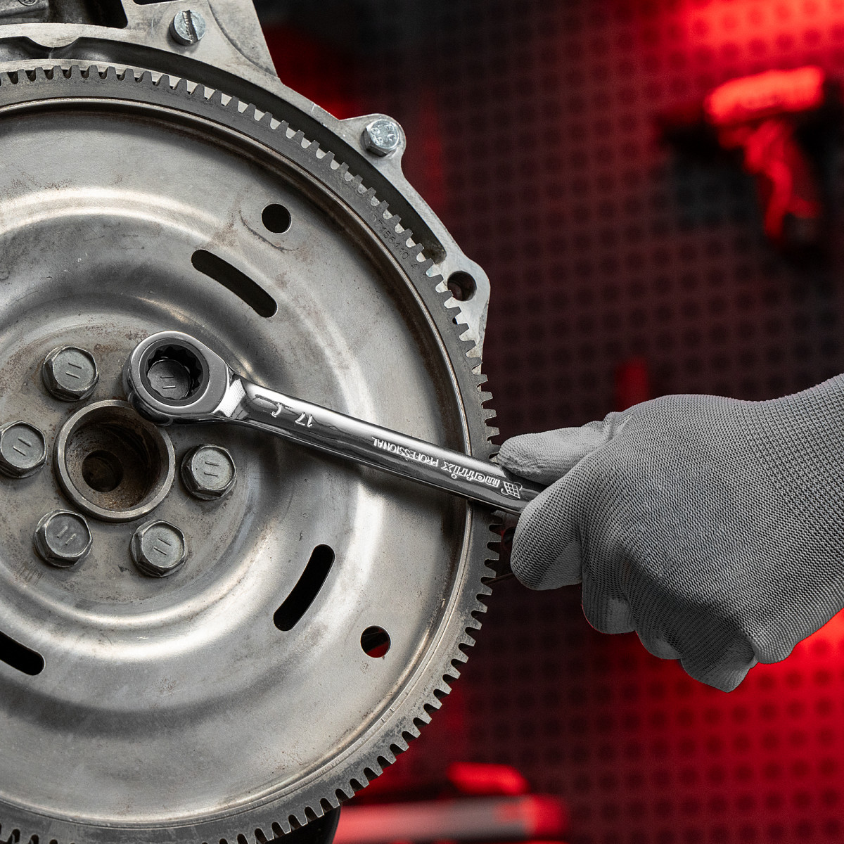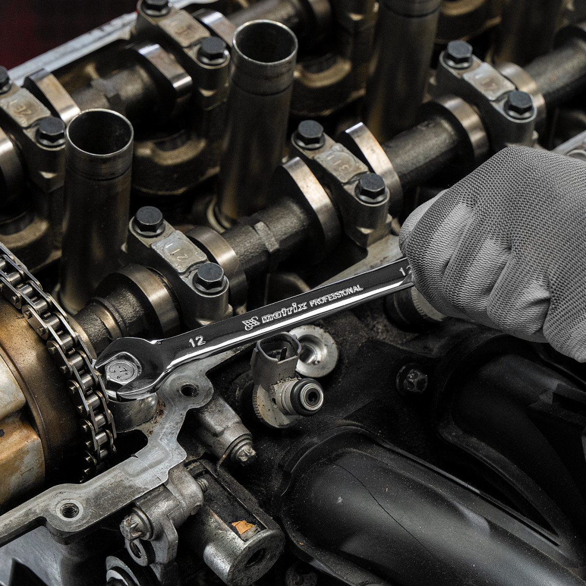 - Эффективная работа — 12-гранный профиль накидной части ключа плотно охватывает поверхность крепежа, предотвращая деформацию его граней.