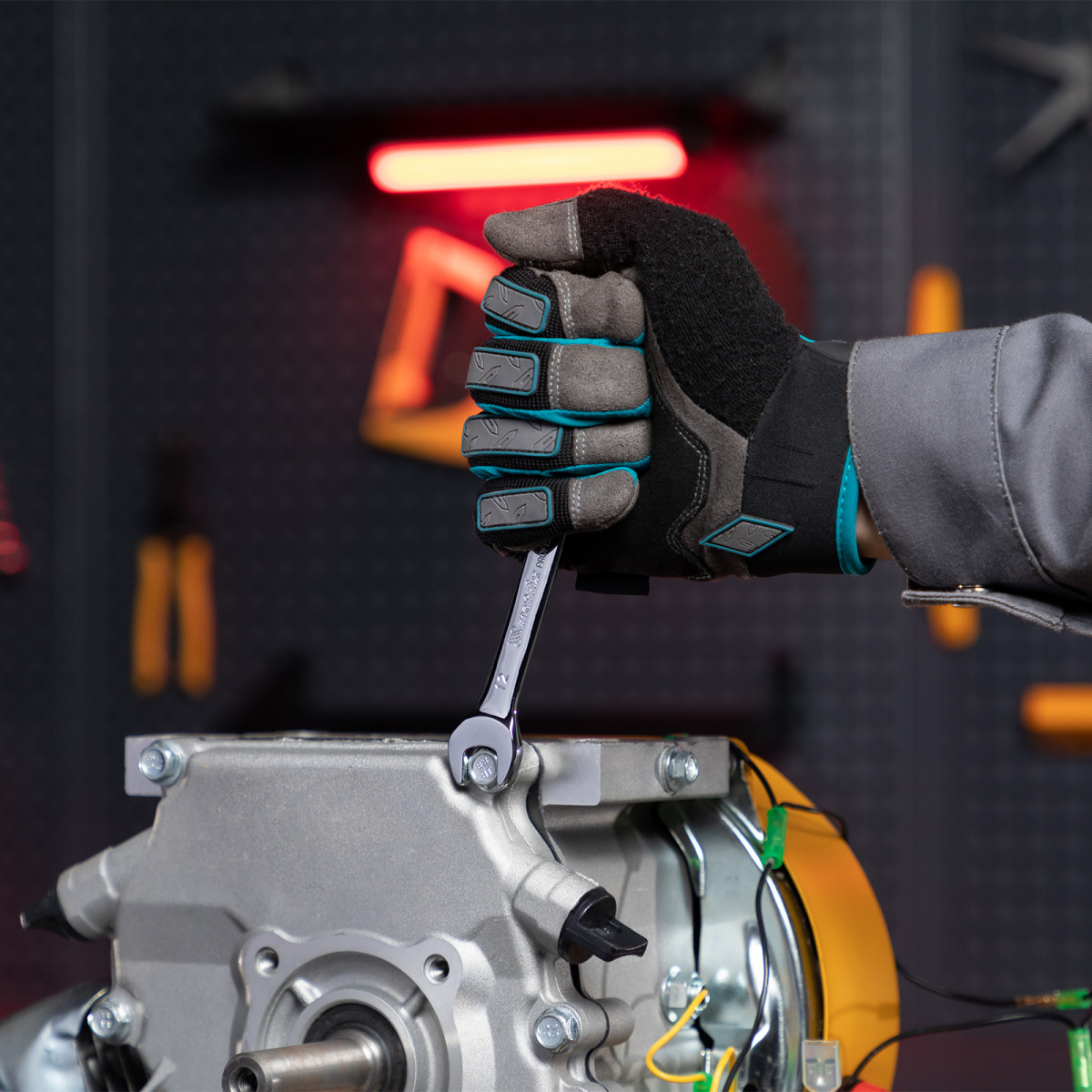 - Удобная работа в труднодоступных местах — храповой механизм на 72 зуба обеспечивает плавное вращение (шаг трещотки составляет 5°), а шарнир позволяет поворачивать рабочую часть под углом.