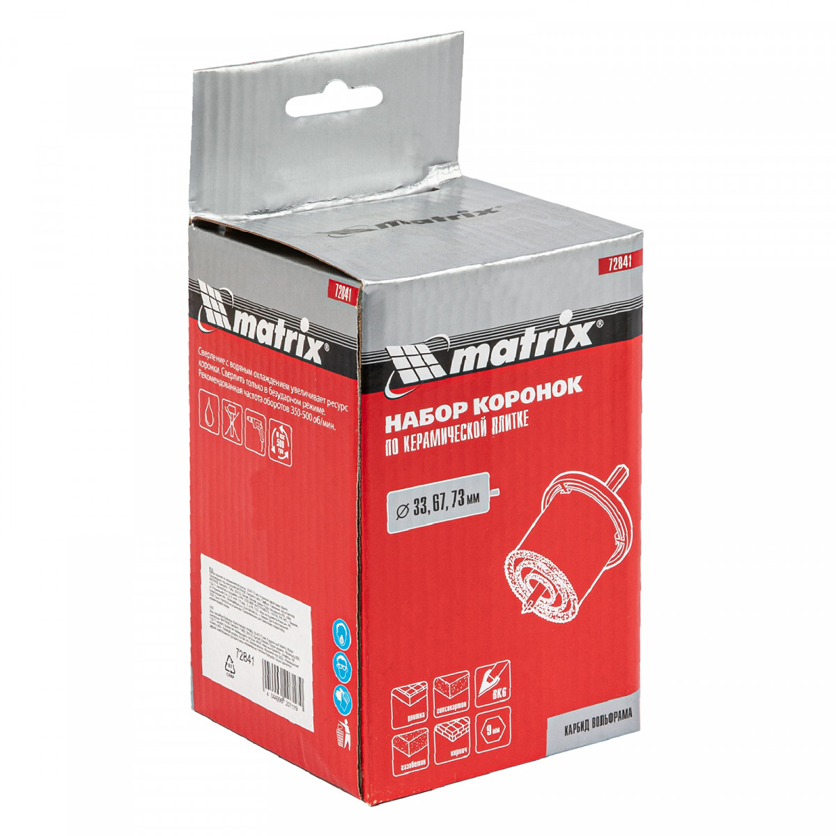 Набор коронок по керамической плитке Matrix 72841 с 6-гранным хвостовиком, 33-67-73 мм, позволяет осуществить сверление отверстий с помощью дрелей и шуруповертов. Он эффективно справляется с керамической плиткой, кирпичом, газосиликатом, гипсокартоном, ячеистым бетоном и пенобетоном. Набор станет незаменимым помощником для частных мастеров. Рекомендуется использовать водяное охлаждение и работать в безударном режиме для предотвращения поломки коронок.1)Универсальный - применяется для сверления отверстий в керамической плитке, пенобетоне, газосиликате, кирпиче, гипсокартоне.2)Быстрая смена коронки - благодаря универсальной державке и специальной формы хвостовика коронки смена коронок проходит за несколько секунд3)Выгодная цена - в наборе только самые ходовые размеры коронок d 33, 67, и 73 мм.4)Высокий ресурс - рабочая часть коронок и пластина центрирующего сверла выполнена из износостойкого сплава карбида вольфрама (ВК6)5)Высокая точность - благодаря центровочному сверлу сверление производится максимально точно 6)Защита от коррозии -корпус коронок и державки покрыт эмалью для защиты от коррозии.