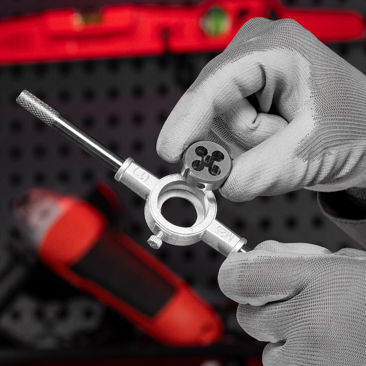 Набор метчиков и плашек М2-М18 Matrix 773110 в металлическом кейсе состоит из 110 предметов — резьбонарезных инструментов и держателей для них. Они позволяют нарезать внутреннюю и наружную резьбу, а также используются для восстановления сорванной резьбы. Благодаря наличию метчиков разного типа набор подходит для работы как со сквозными, так и с глухими отверстиями. Набор будет полезен в сервисном центре, авторемонтной мастерской, пригодится также в быту.