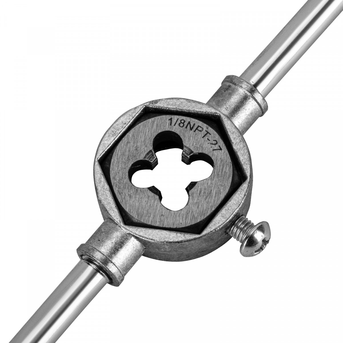 - Получение ровной внешней резьбы — плашка закрепляется при помощи бокового винта и не проворачивается в держателе.