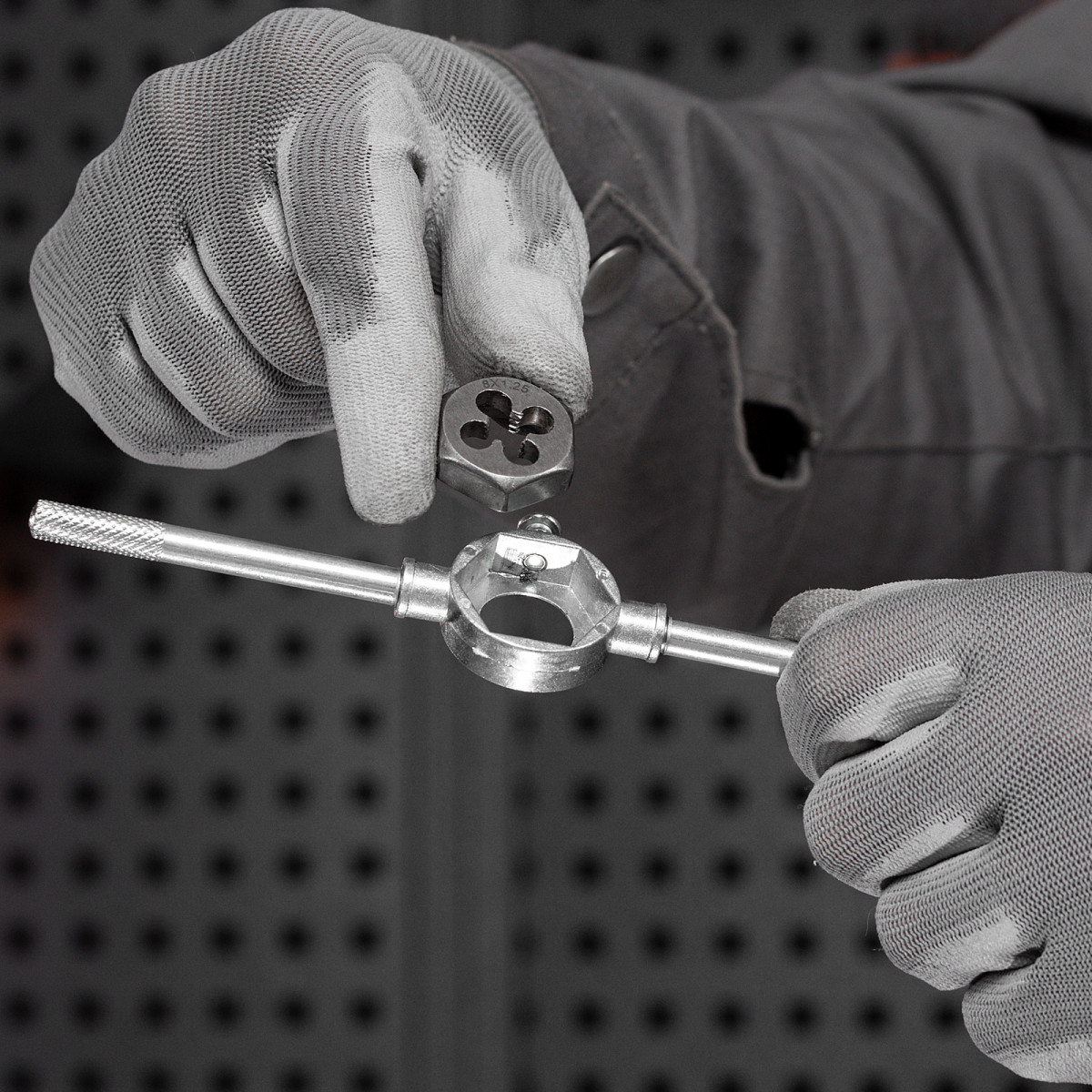 - Получение ровной внешней резьбы — плашки закрепляются при помощи бокового винта и не проворачиваются в держателе.