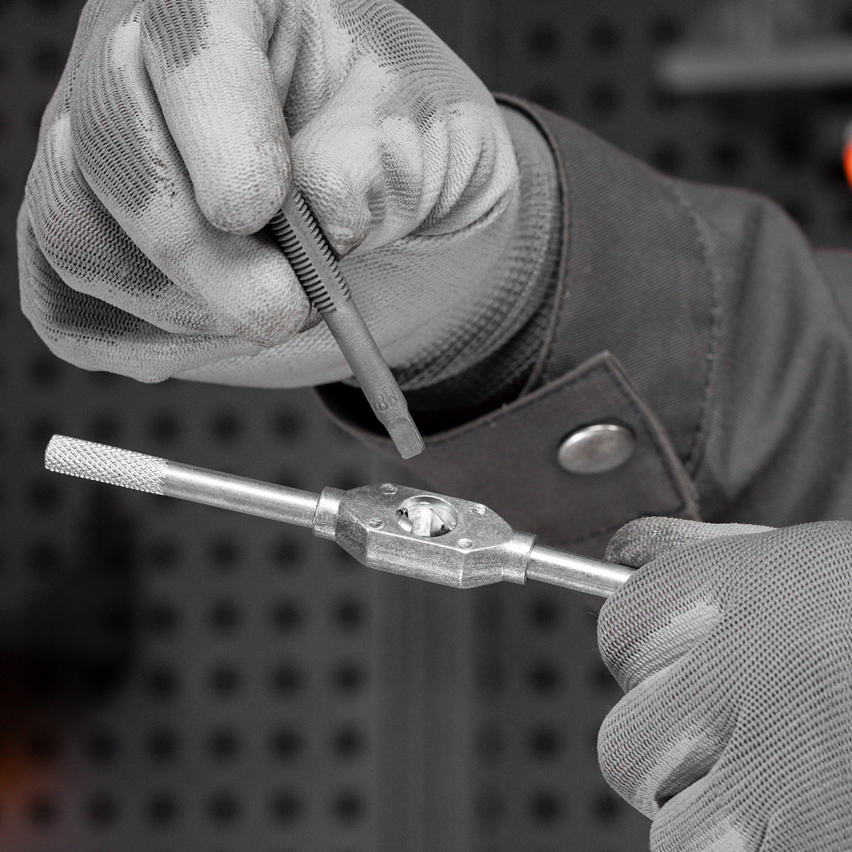 - Универсальный метчикодержатель — регулируемый винтовой механизм позволяет надежно фиксировать метчики с хвостовиками от 2,4 до 6,4 мм.