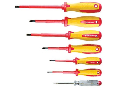 Набор диэлектрических отверток до 1000В, MATRIX PROFESSIONAL 13355 предназначен для работ под напряжением до 1000 В. В наборе 6 отверток ( SL1.2 x 6.5 x150 мм, SL 1.0 x 5.5 x 12 мм, SL 0.5 x 3.0 x 80 мм, РН №0 х 75 мм, РН №1 х 75 мм, РН №2 х 100 мм ) и отвертка-пробник (напряжение 120–250 В). Имеют удобную рукоятку, стержень отверток намагничен.
