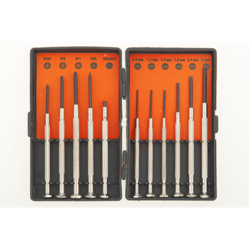Набор отверток для точной механики, 11 шт SPARTA 133605 предназначен для механических работ с мелкими деталями. В наборе 11 отверток (№00; №0; №1; AWL; MAGNES; 0,9 мм; 1,2 мм; 1,4 мм; 1,8 мм; 2,4 мм; 3 мм). Стальные рукоятки со специальным рифлением не выскальзывают из рук. Набор упакован в удобный пластиковый бокс.