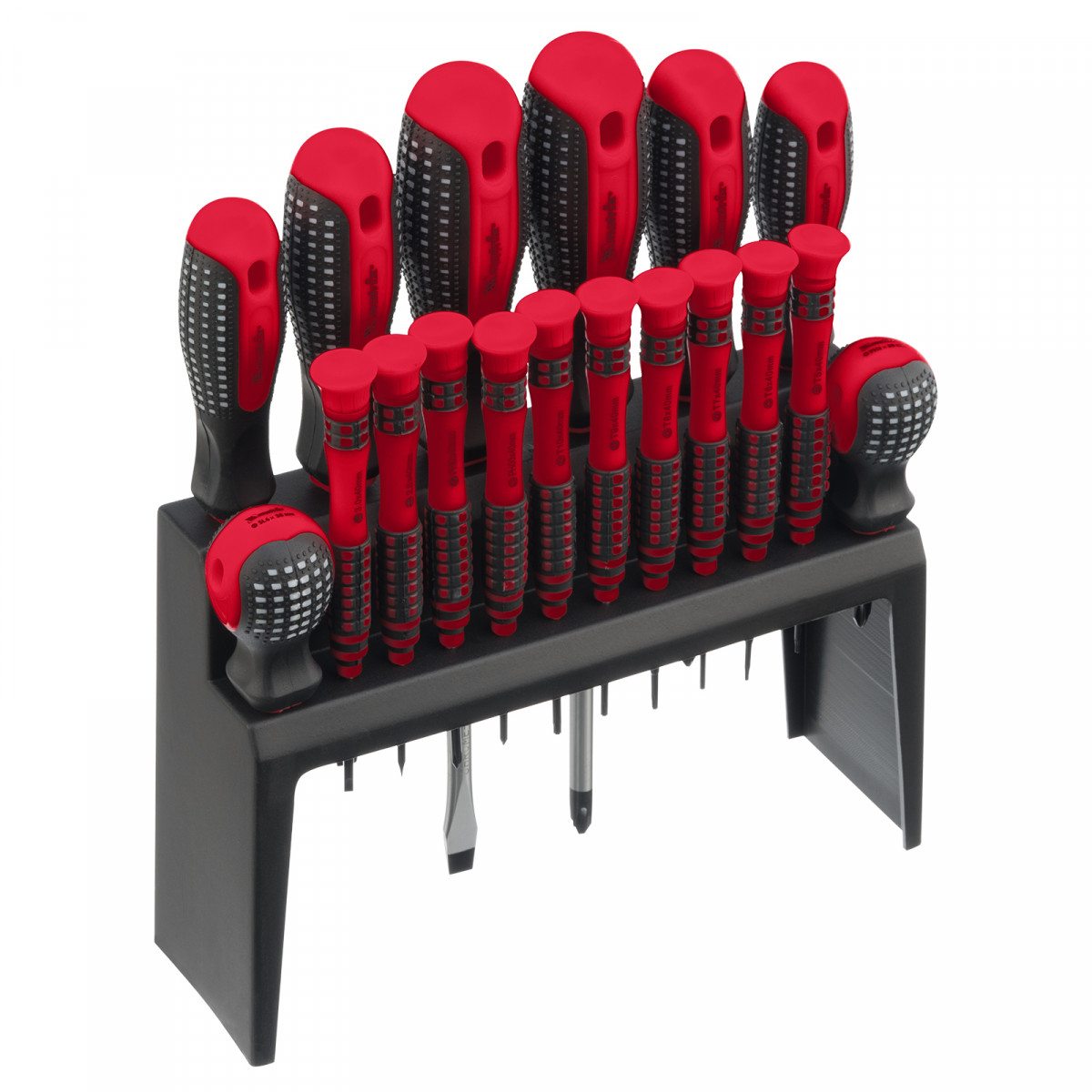 - Удобное хранение — отвертки размещаются на пластиковой подставке, которую можно поставить на стол или повесить на стену.