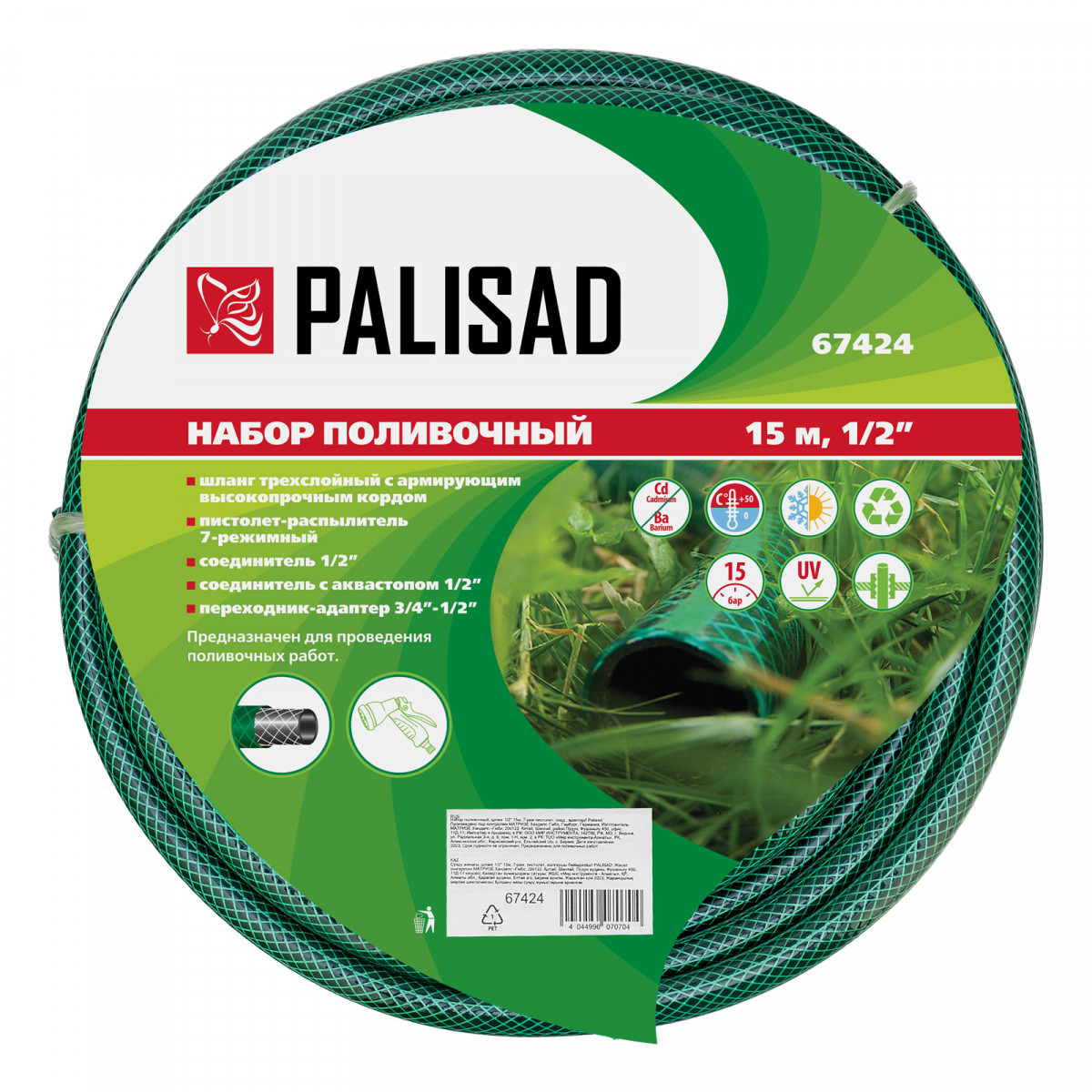 Набор поливочный, шланг 1/2", 15 м, 7 режимов пистолет, соединитель, адаптер Palisad
