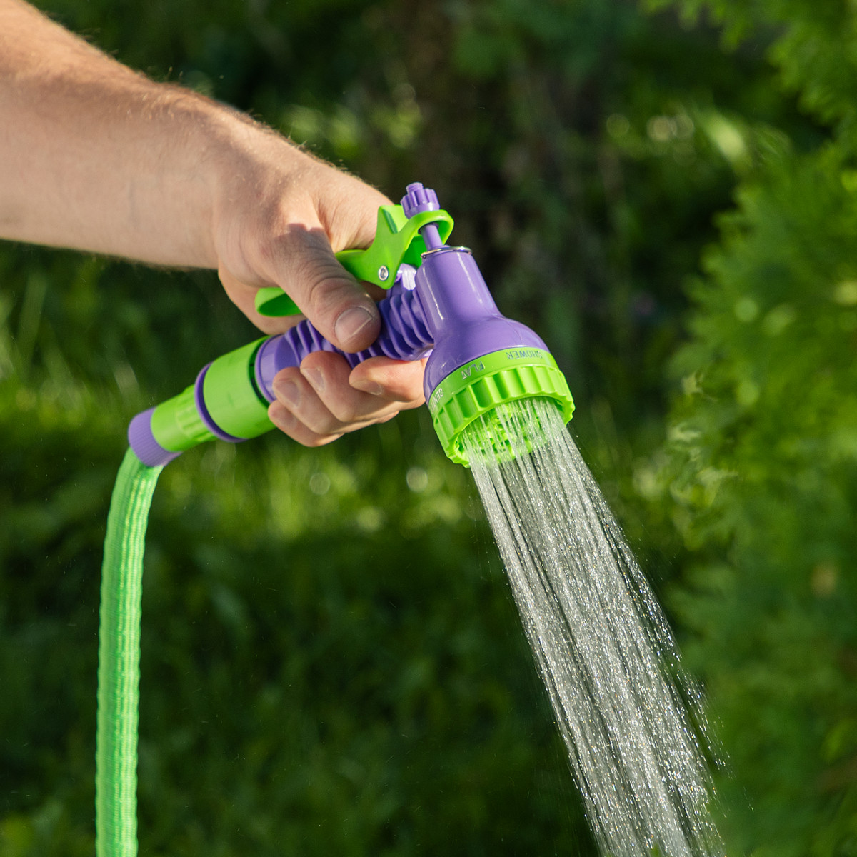 - Охват значительной площади полива — в растянутом состоянии длина шланга достигает 30 м.
