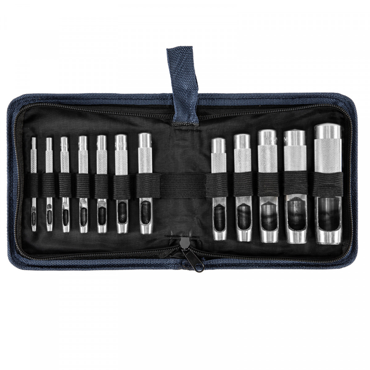 Набор пробойников для кожи Сибртех 18312, 12 шт. в чехле, позволяет пробить отверстия диаметром 3, 4, 5, 7, 6, 8, 9, 10, 12, 14, 16 и 19 мм посредством ударного воздействия от киянки. Инструменты предназначены для работы с плотными материалами: кожей и резиной. Благодаря высокоточной прецизионной заточке режущих кромок пробойники выполняют ровный и качественный рез.