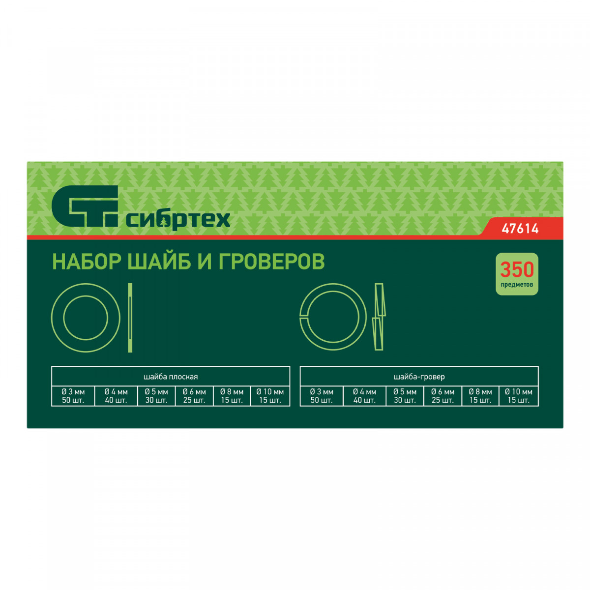 Набор шайб и гроверов, D шайб: 3, 4, 5, 6, 8, 10 мм D гроверов: 3, 4, 5, 6, 8, 10 мм, 350 предметов Сибртех