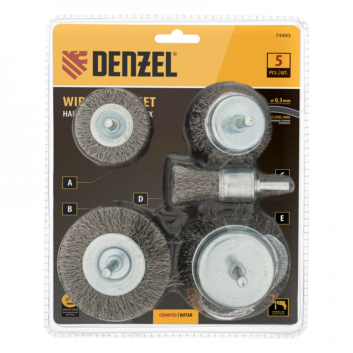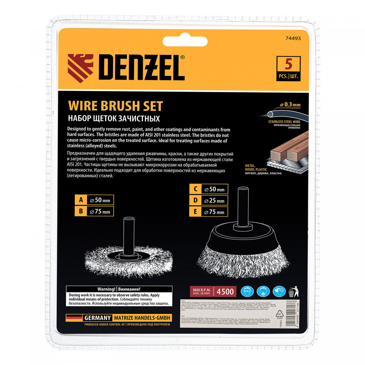 Набор щеток для дрели, 2 Плоские 50-75мм, 3 Чашки 25-50-75мм, шпилька, нерж.вит. проволока Denzel