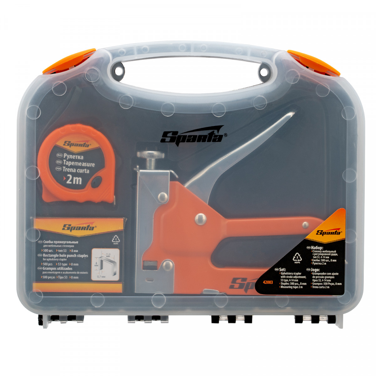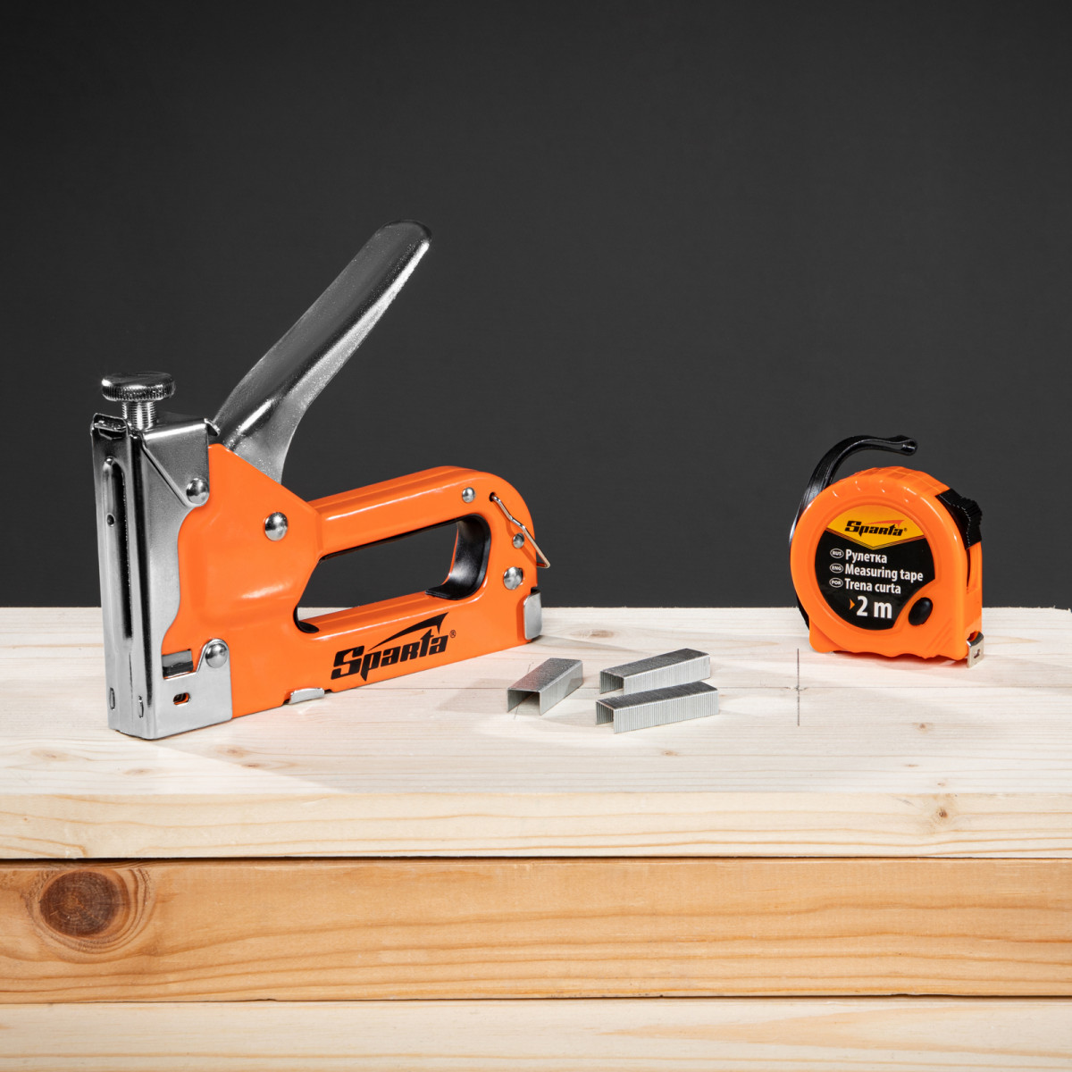 Набор: степлер мебельный регулируемый, скобы 500 шт, рулетка 2 м, тип скобы 53, 4-14 мм Sparta