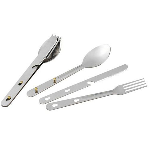 Набор столовых приборов (ложка, вилка, нож). Весь набор компактно собирается на фиксаторах на ложке. На ноже сделан ключ для открывания крышек.
