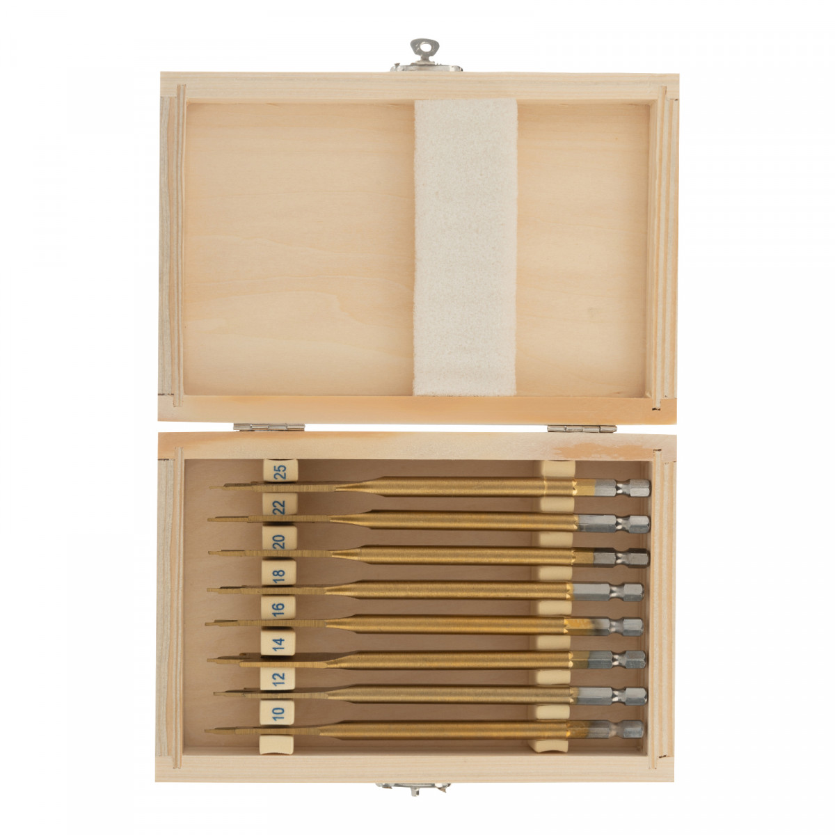 - Износостойкость — сверла имеют нитридтитановое покрытие, а режущие кромки закалены до необходимой твердости.
