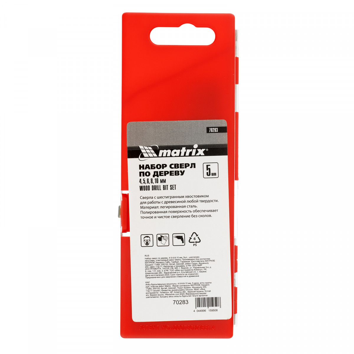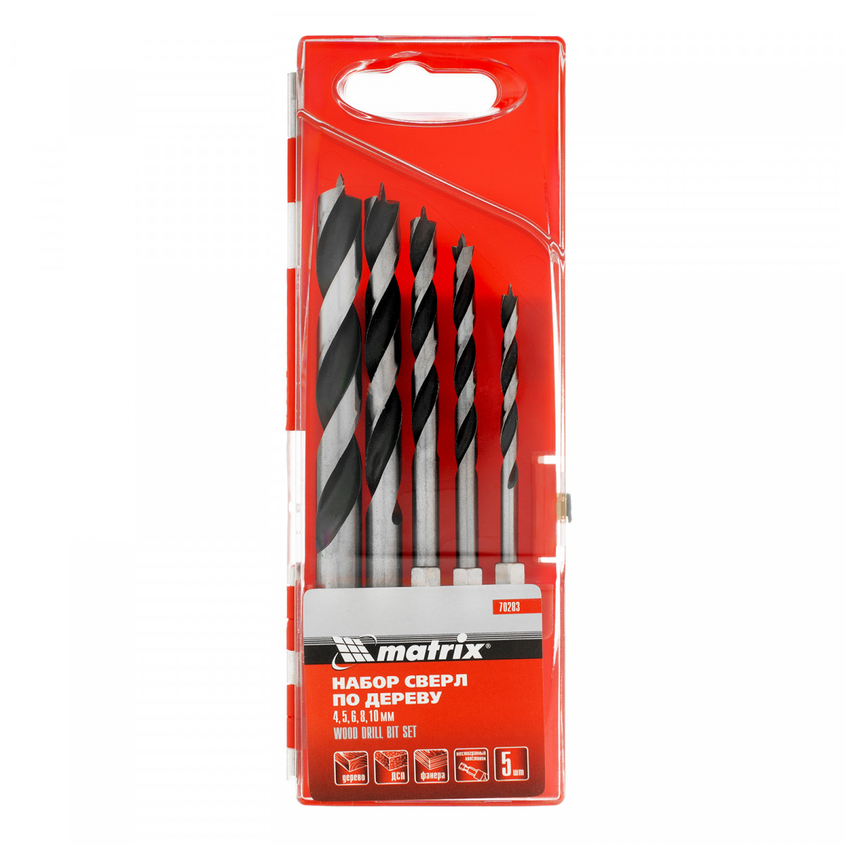 Набор сверл по дереву, 4-5-6-8-10 мм, 5 шт, шестигранный хвостовик, пластиковый кейс, Matrix
