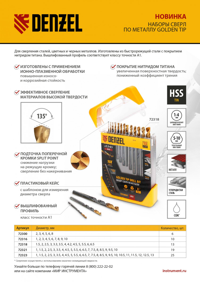 Набор сверл по металлу, 1-10 мм, HSS-Tin, Golden Tip, 10 шт Denzel