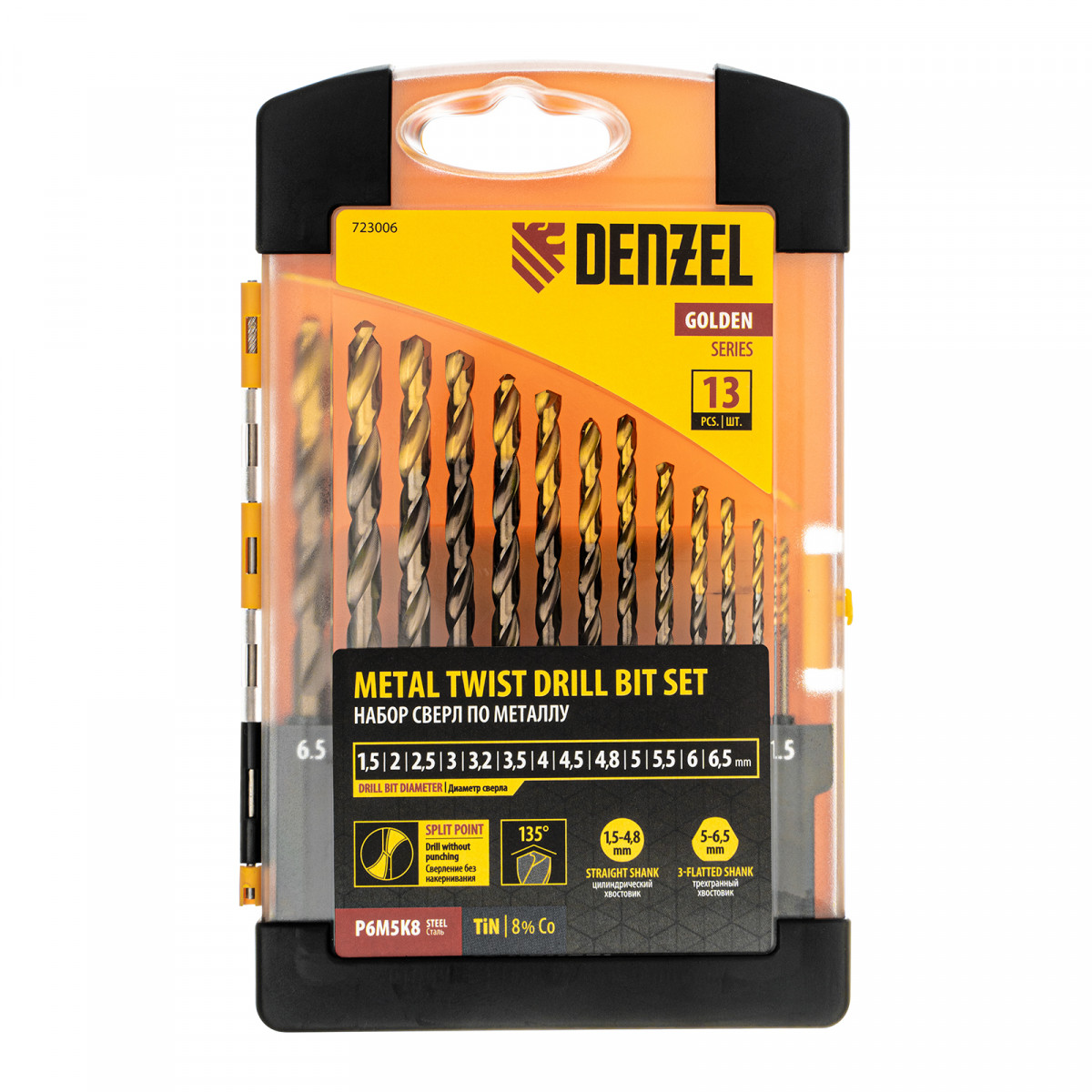 Набор сверл по металлу, 1,5-6,5мм, Р6М5К8-TiN, Golden Tip, 13 шт Denzel