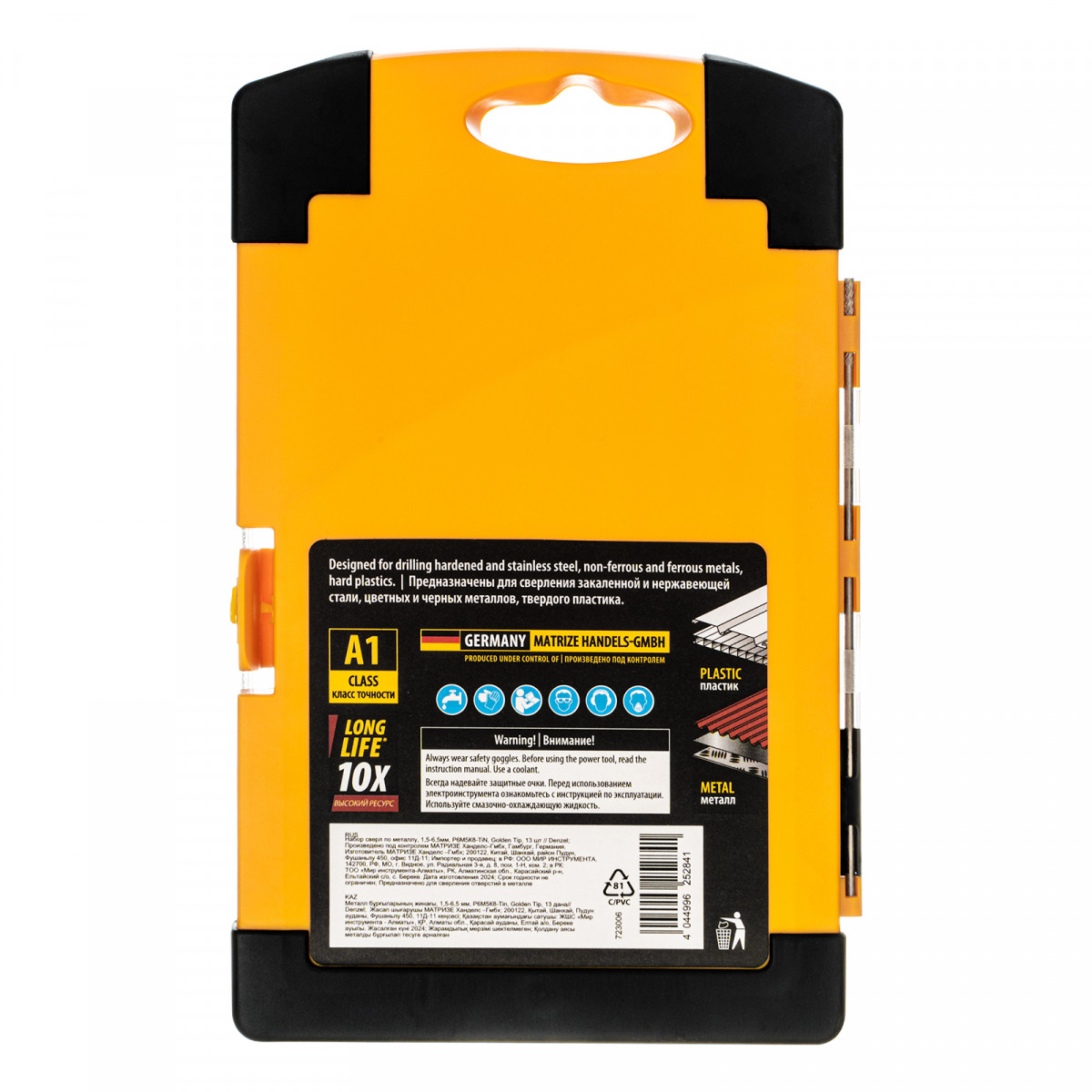Набор Denzel Golden Tip 723006 состоит из 13 сверл по металлу диаметром 1,5-6,5 мм, изготовленных из стали P6M5K8. Угол заточки составляет 135°, что позволяет получать чистые и ровные отверстия в закаленной и нержавеющей стали, цветных и черных металлах, а также жестком пластике. Сверлам присвоен класс точности A1, что гарантирует высокое качество выполняемых работ. Оснастка характеризуется пониженным коэффициентом трения, что облегчает сверление и улучшает отвод стружки. Набор будет полезен дома и в мастерской.