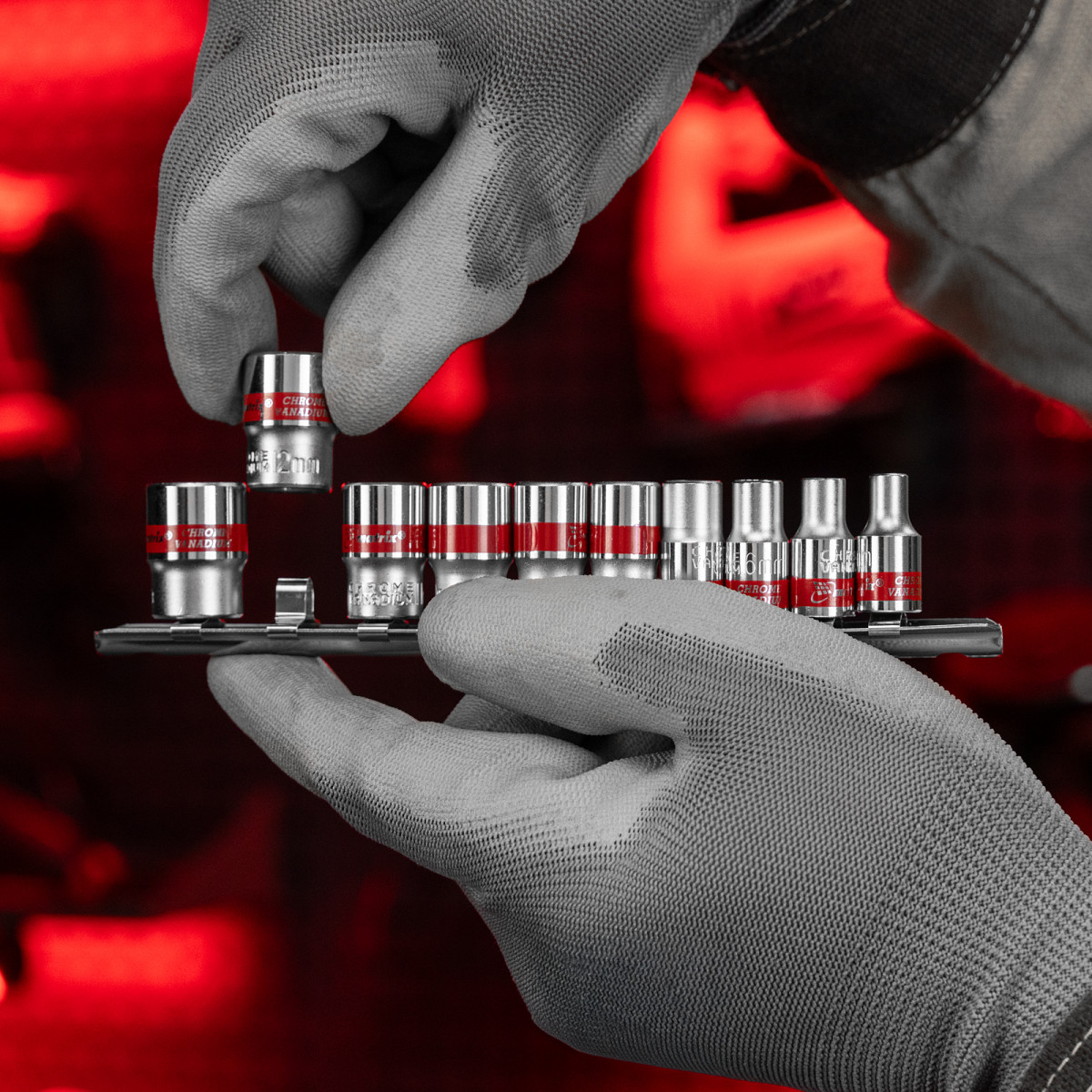 • Быстрый поиск нужной торцевой головки — на корпусах насадок имеются красные полоски и маркировка с обозначением размера.