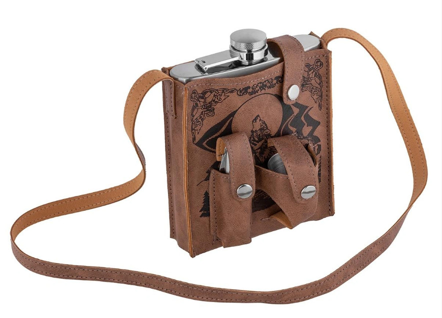 Туристический набор Волк - стильный и брутальный подарок для настоящего мужчины. Отлично подходит в качестве практичного подарка для человека, который увлекается походами и рыбалкой. В набор входят мультитул, 3 легкие стопки по 30мл, которые практично и удобно прикрепляются к чехлу от фляги. Фляжка и стопки изготовлены из нержавеющей стали. На чехол сверху нанесен рисунок.