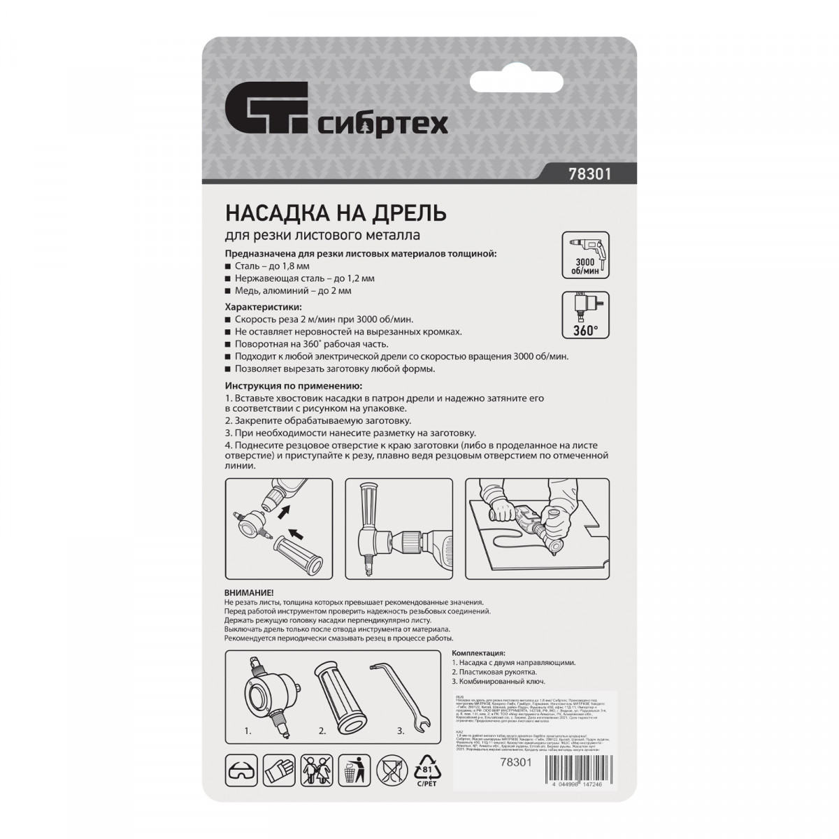 Насадка на дрель для резки листового металла Сибртех 78301 позволяет разрезать сталь толщиной до 1,8 мм, нержавеющую сталь толщиной до 1,2 мм, медь и алюминий — до 2 мм. Ширина реза составляет 6 мм, он может быть не только прямым, но и фигурным. Приспособление устанавливается на электрические дрели со скоростью вращения 3000 об/мин. Насадка для резки металла будет полезна при проведении кровельных работ, а также пригодится в слесарной мастерской, на даче или в гараже.