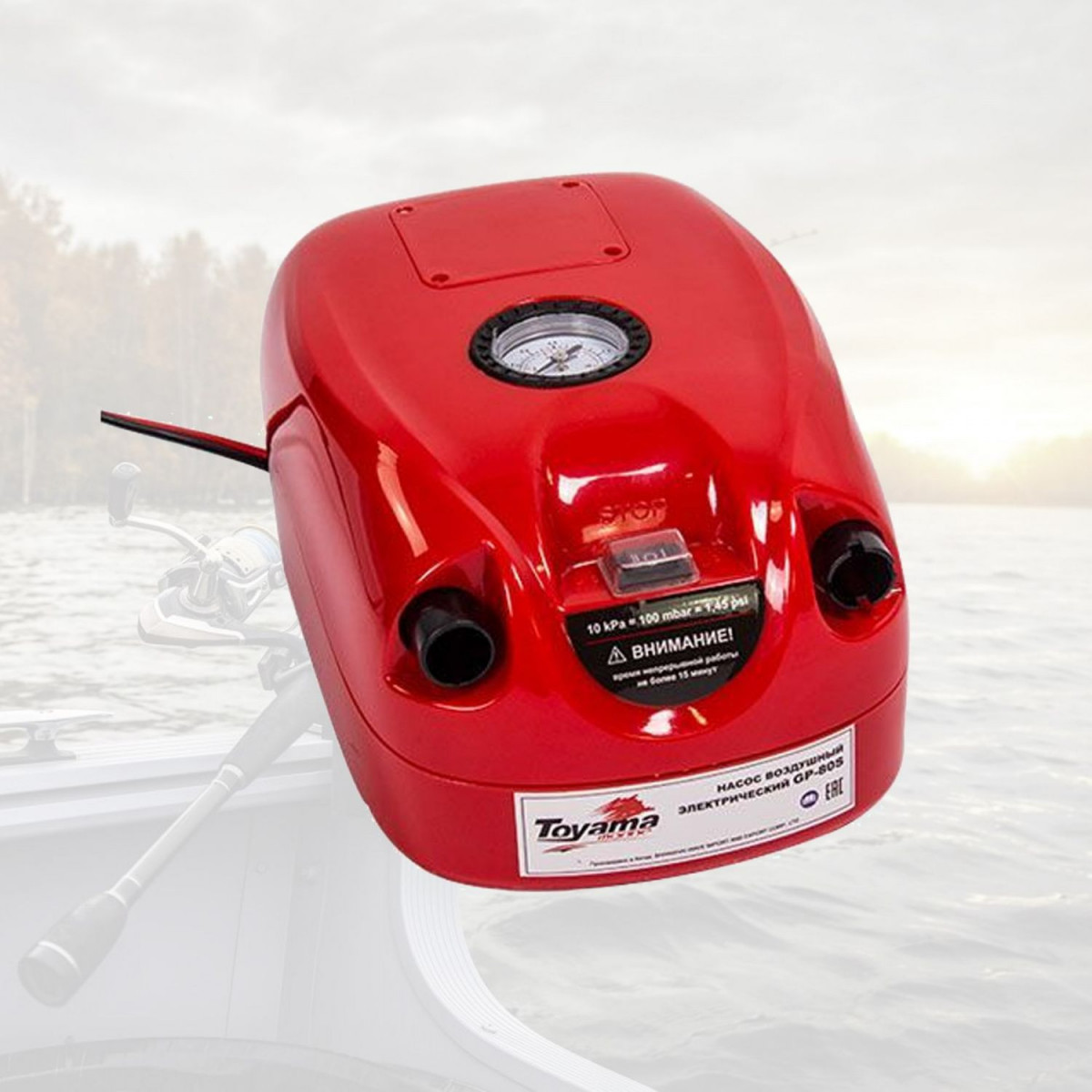 Электрический насос Toyama GP-80S предназначен для накачивания лодок, матрасов, бассейнов и откачивания воздуха из них. Имеет производительность 500 л/мин, питание 12V от аккумулятора. Контроль за давлением осуществляется при помощи манометра. Способен накачать надувную лодку в среднем за 5 минут. Время непрерывной работы - 15 минут. Длина шланга - 1.8 м.