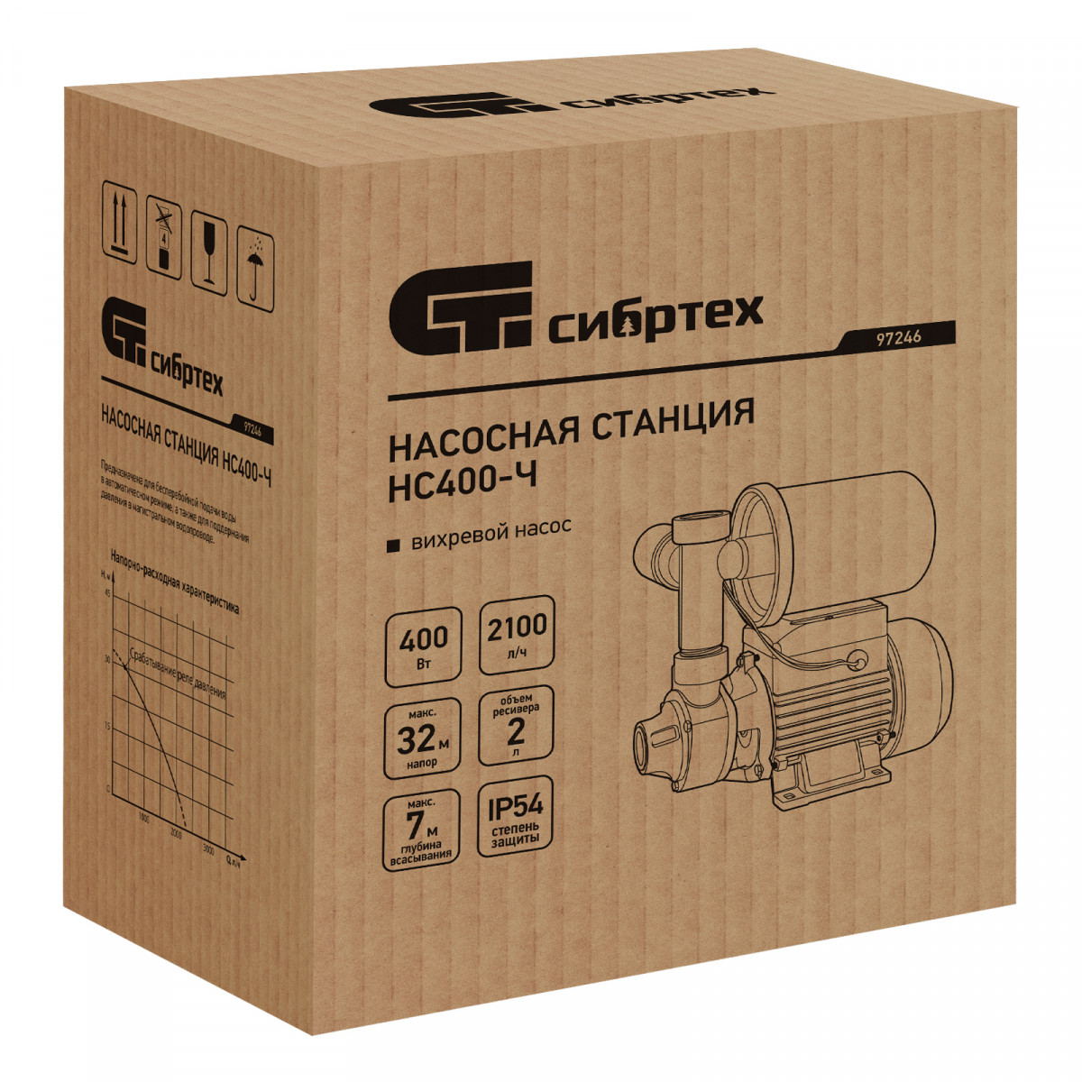 Насосная станция Сибртех НС400-Ч 97246 мощностью 400 Вт, с ресивером на 2 л, обеспечивает напор до 32 м и производительность до 2100 л/ч. Предназначена для бесперебойной подачи чистой воды с глубины до 7 м, позволяет организовать водоснабжение на дачном участке. Насосная станция поддерживает стабильное давление в напорной магистрали и оптимальна для создания системы полива.