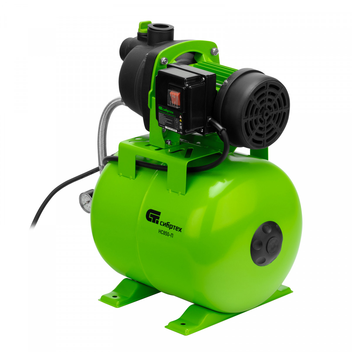 Насосная станция Сибртех НС850-П 97248 мощностью 850 Вт, с ресивером на 19 л, работает со скоростью 3500 л/ч и обеспечивает напор до 42 м. Используется для обеспечения подачи воды в загородных домах, поддержания давления в системе водоснабжения квартир. Однофазный мотор обеспечивает производительность на уровне 58 л/мин под давлением не более 2,8 бар.,Станция работает в автоматическом режиме: накапливает воду в ресивере и включается по мере ее потребления. Подача воды также происходит экономно: она поступает к сантехническому оборудованию и кранам только в момент их включения. Пробка заливной горловины легко откручивается, поэтому подготовить насосную станцию к первому запуску не составит труда.