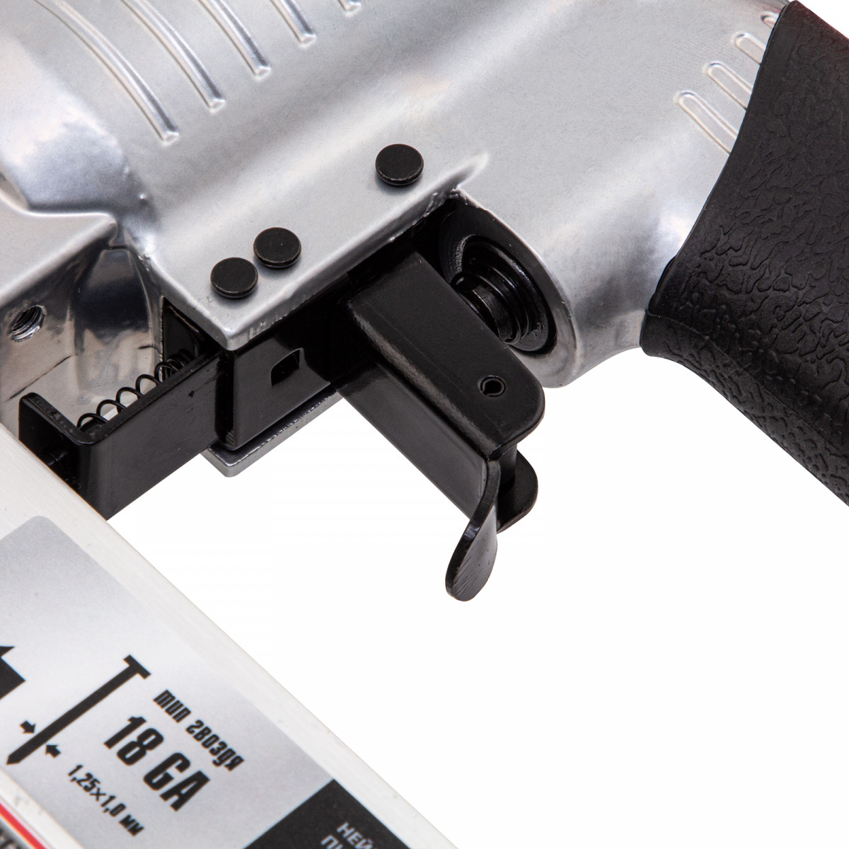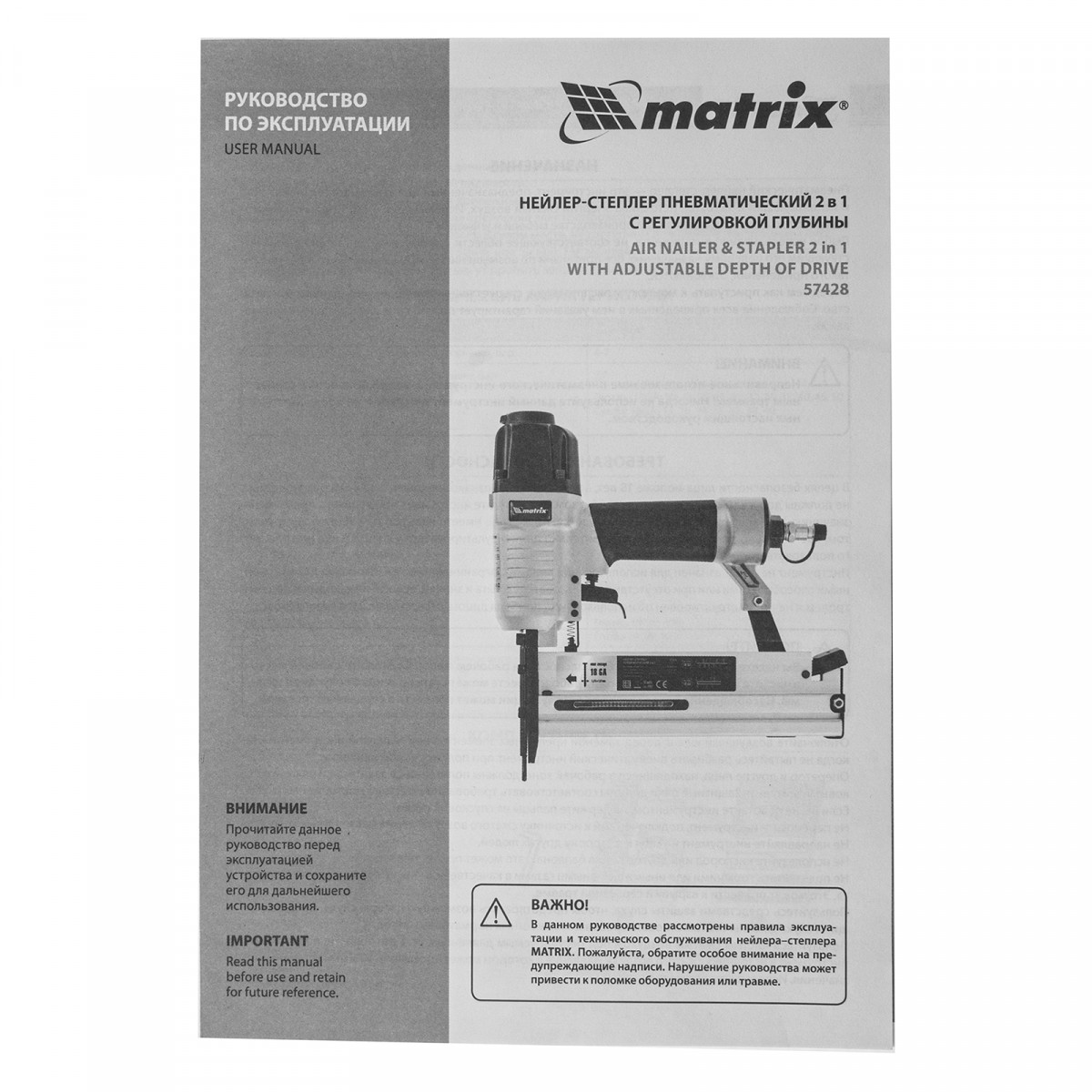 Пневматический нейлер-степлер Matrix 2 в 1 57428 с функцией регулировки глубины забивания предназначен для быстрого скрепления различных материалов гвоздями и скобами 18GA. Его используют для сборки мебели и деревянных каркасов, обшивки и утепления домов, монтажа окон, дверей, плинтусов или напольных покрытий. Нейлер-степлер подключается к любым типам компрессоров, т.к. расход воздуха составляет всего 0,7 л/мин.